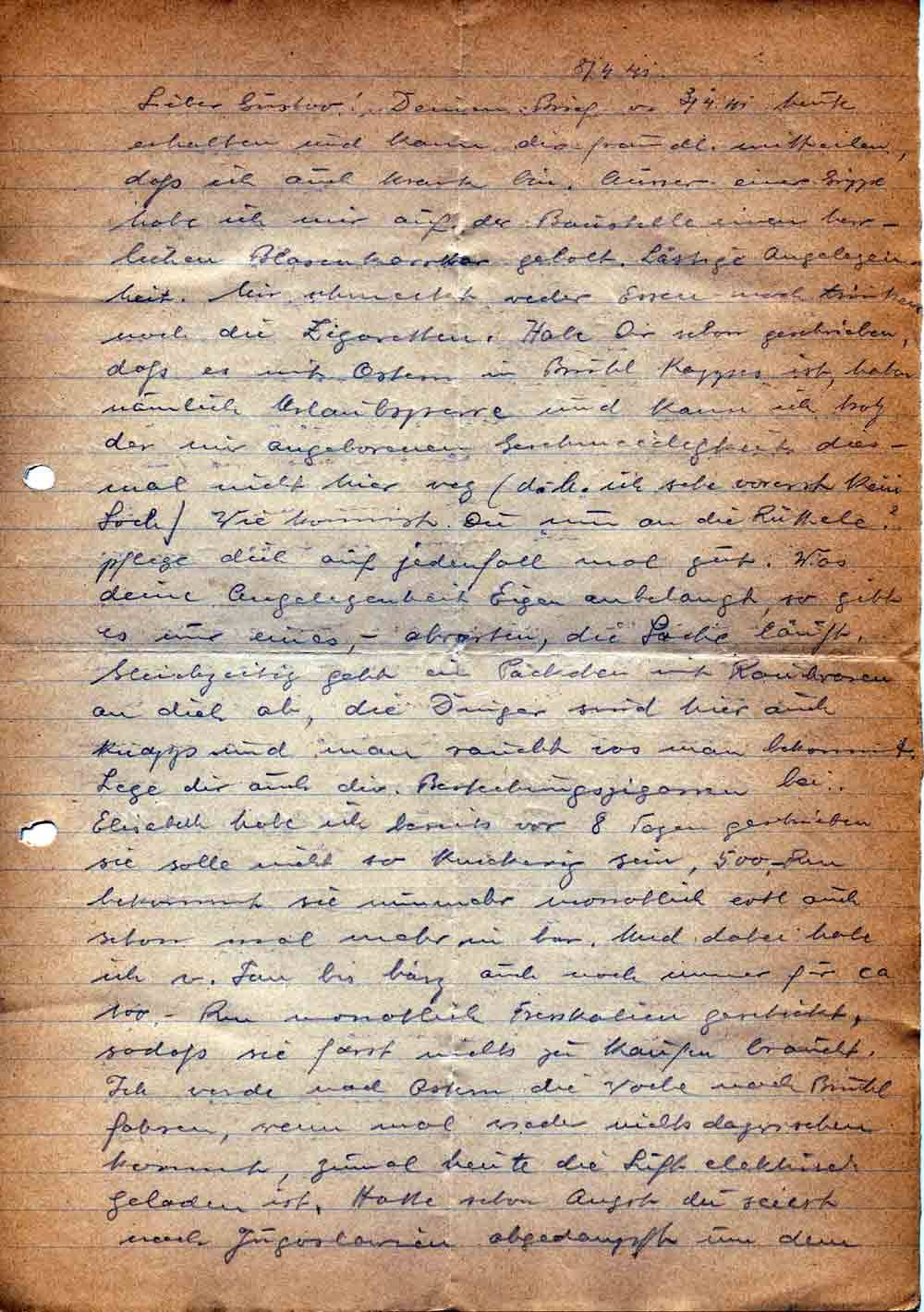 Lieber Gustav! Deinen Brief v. ¾.41 heute erhalten und kann dir freundl. mitteilen, daß ich auch krank bin. Ausser einer Grippe habe ich mir auf der Baustelle einen herrlichen Blasenkarrthar geholt. Lästige Angelegenheit. Mir schmeckt weder Essen noch trinken noch die Zigaretten. Habe Dir schon geschrieben, daß es mit Ostern in Brühl Kappes ist, haben nämlich Urlaubssperre und kann ich trotz der mir angeborenen Geschmeidigkeit diesmal nicht hier weg (d. h. ich sehe vorerst kein Loch). Wie kommst Du nun an die Rüttele? pflege dich auf jedenfall mal gut. Was deine Angelegenheit Eigen anbelangt, so gibt es nur eines, - abwarten, die Sache läuft. Gleichzeitig geht ein Päckchen mit Rauchwaren an dich ab, die Dinger sind hier auch knapp und man raucht was man bekommt. Lege dir auch div. Bestechungszigarren bei. Elisabeth habe ich bereits vor 8 Tagen geschrieben sie solle nicht so knickerig sein, 500,- Rm bekommt sie nunmehr monatlich evtl. auch schon mal mehr in bar. Und dabei habe ich v. Jan. bis März auch noch immer für ca. 100,- Rm monatlich Fresskalien geschickt, sodaß sie fast nichts zu kaufen braucht. Ich werde nach Ostern die Woche nach Brühl fahren, wenn mal wieder nichts dazwischen kommt, zumal heute die Luft elektrisch geladen ist. Hatte schon Angst du seiest nach Jugoslawien abgedampft um dem