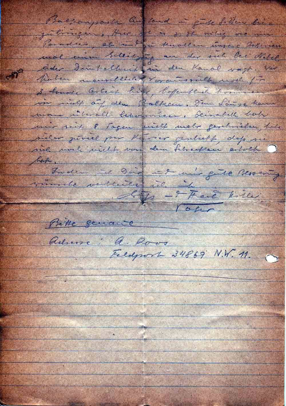 Balkanpack Anstand u. gute Sitten beizubringen. Hier ist es z. Zt. richtig wie im Paradies, ab und zu knallen unsere Batterien mal einen Geleitzug an der sich bei Nebel oder Dunkelheit in den Kanal wagt. Wir haben menschlicher Voraussicht noch für 3 Monate Arbeit hier, hoffentlich kommen wir nicht auf den Balkan. Denn Läuse kann man überall bekommen. Elisabeth hat mir seit 8 Tagen nicht mehr geschrieben, habe sicher zuviel per Kurier geschickt, daß sie sich noch nicht von dem Schrecken erholt hat.
