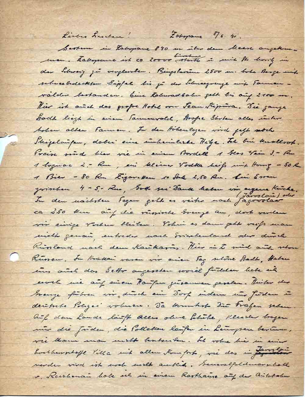 Gestern in Zakopane 840 m über dem Meere angekommen. Zakopane ist ca. 20000 Einwohner stark u. mit St. Moritz in der Schweiz zu vergleichen. Ringsherum 2500 m. hohe Berge mit schneebedeckten Gipfel bis zu der Schneegrenze mit Tannenwälder bestanden. Eine Zahnradbahn geht bis auf 2100 m. Hier ist auch das große Hotel von Sean Kipura. Die ganze Stadt liegt in einem Tannenwald, Straße Gärten alles unter hohen alten Tannen. In den Höhenlagen wird jetzt noch Skigelaufen, dabei eine unheimliche Hitze. Ich bin knallrot. Preise sind hier wie in einem Bordell 1 Glas Wein 3,- Rm 1 Cognac 2,- Rm, ein kleiner Wodka heiß mit Honig -50 Rm 1 Bier -80 Rm Zigaretten 10 Stck 2,50 Rm. Ein Essen zwischen 4-5,- Rm, Gott sei Dank haben wir eigene Küche. In den nächsten Tagen geht es weiter nach (Jaroslau) oder Jagowslaw ca. 250 km auf die russische Grenze an, dort werden wir einige Wochen bleiben. Wohin es dann geht weiß man nicht genau, entweder nach Griechenland oder durch Russland nach dem Kaukasus. Hier in Z sind auch schon Russen. In Krakau waren wir einen Tag schöne Stadt. Haben uns auch das Getto angesehen soviel Judden habe ich noch nie auf einem Haufen zusammen gesehen. Hinter der Grenze fuhren wir durch ein Dorf indem nur Juden u. deutsche Polizei wohnen. Da konntest Du Fratzen sehen. Auf dem Lande läuft alles ohne Schuhe, Kleider tragen nur die Juden, die Pollaken laufen in Lumpen herum, wie kann man nicht beschreiben. Ich wohne hier in einer hochherrschaftl. Villa mit allem Komfort, wie das in Jaroslau werden wird ist noch nicht amtlich. Generalfeldmarschall v. Reichenau habe ich in einem Rasthause auf der Autobahn