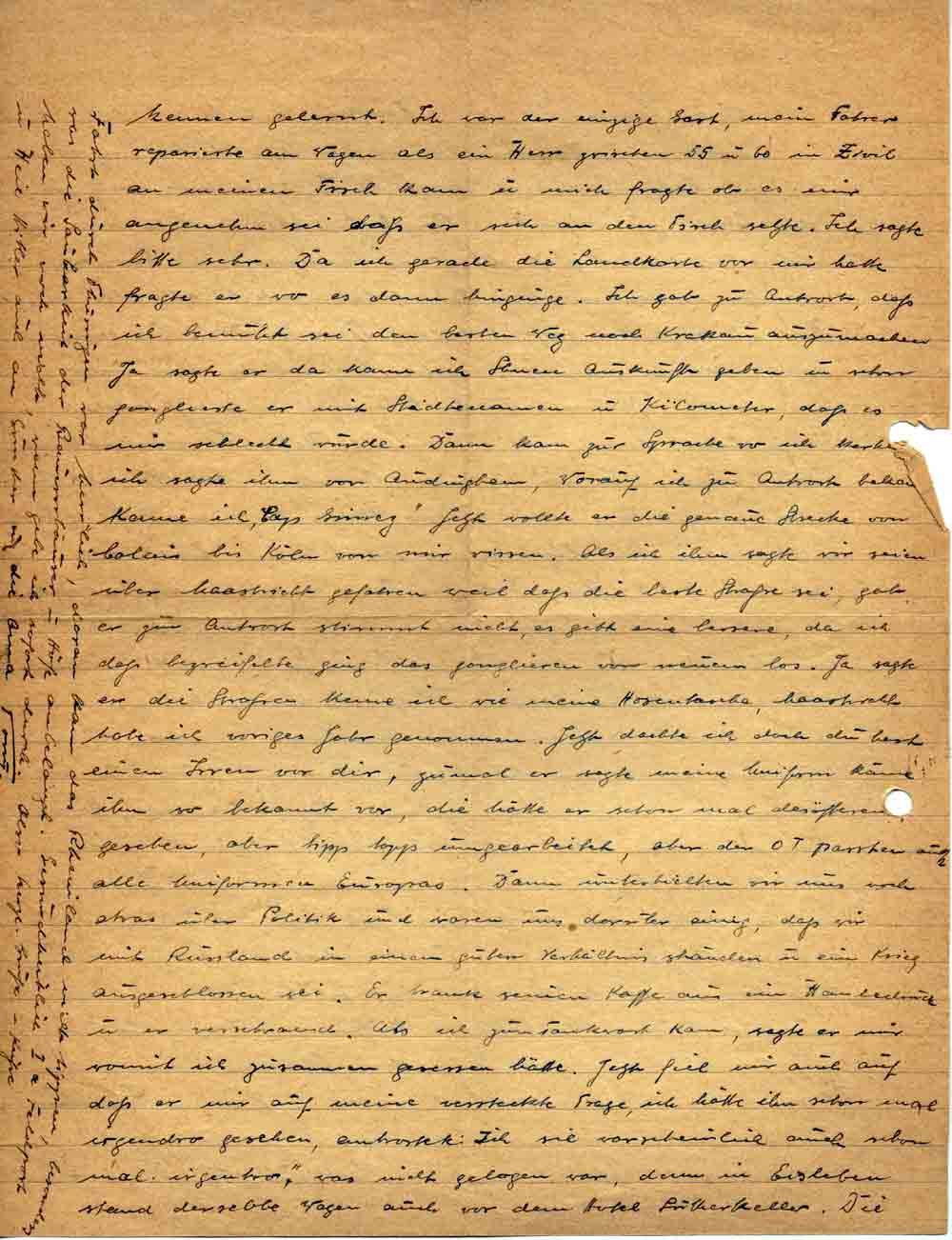 kennen gelernt. Ich war der einzige Gast, mein Fahrer reparierte am Wagen als ein Herr zwischen 55 u. 60 in Zivil an meinen Tisch kam u. mich fragte ob es mir angenehm sei daß er sich an den Tisch setzte. Ich sagte bitte sehr. Da ich gerade die Landkarte vor mir hatte fragte er wo es dann hinginge. Ich gab zu Antwort, daß ich bemüht sei den besten Weg nach Krakau auszumachen . Ja sagte er da kann ich Ihnen Auskunft geben u. schon jonglierte er mit Städtenamen u. Kilometer, daß es mir schlecht wurde. Dann kam zur Sprache wo ich herkomme ich sagte ihm von Audingham, Worauf ich zur Antwort bekam „kenne ich, Cap [?]“ Jetzt wollte er die genaue Strecke von Calais bis Köln von mir wissen. Als ich ihm sagte wir seien über Maastricht gefahren weil daß die beste Straße sei, gab er zur Antwort stimmt nicht, es gibt eine bessere, da ich daß bezweifelte ging das jonglieren von neuem los. Ja sagte er die Straßen kenne ich wie meine Hosentasche, Maastricht habe ich voriges Jahr genommen. Jetzt dachte ich doch du hast einen Irren vor dir, zumal er sagte meine Uniform käme ihm so bekannt vor, die hätte er schon mal desöfteren gesehen, aber tipp topp umgearbeitet, aber der OT passten auf alle Uniformen Europas. Dann unterhielten wir uns noch etwas über Politik und waren uns darüber einig, daß wir mit Russland in einem guten Verhältnis ständen u. ein Krieg ausgeschlossen sei. Er trank seinen Kaffe aus ein Händedruck u. er verschwand. Als ich zum Tankwart kam, sagte er mir womit ich zusammen gesessen hätte. Jetzt fiel mir auch auf daß er mir auf meine versteckte Frage, ich hätte ihn schon mal irgendwo gesehen, antwortete: Ich sie warscheinlich auch schon mal irgentwo“, was nicht gelogen war, denn in Eisleben stand derselbe Wagen auch vor dem Hotel Lutherkeller. Die Fahrt durch Thüringen war herrlich, daran kann das Rheinland nicht tippen, besonders was die Sauberkeit der Bauernhäuser u. Höfe anbelangt. Gesundheitlich I a Feldpost haben wir noch nicht, wenn gebe ich sofort durch. Also herzl. Grüße u. Küße u. Heil Hitler auch an Günther u. die Oma