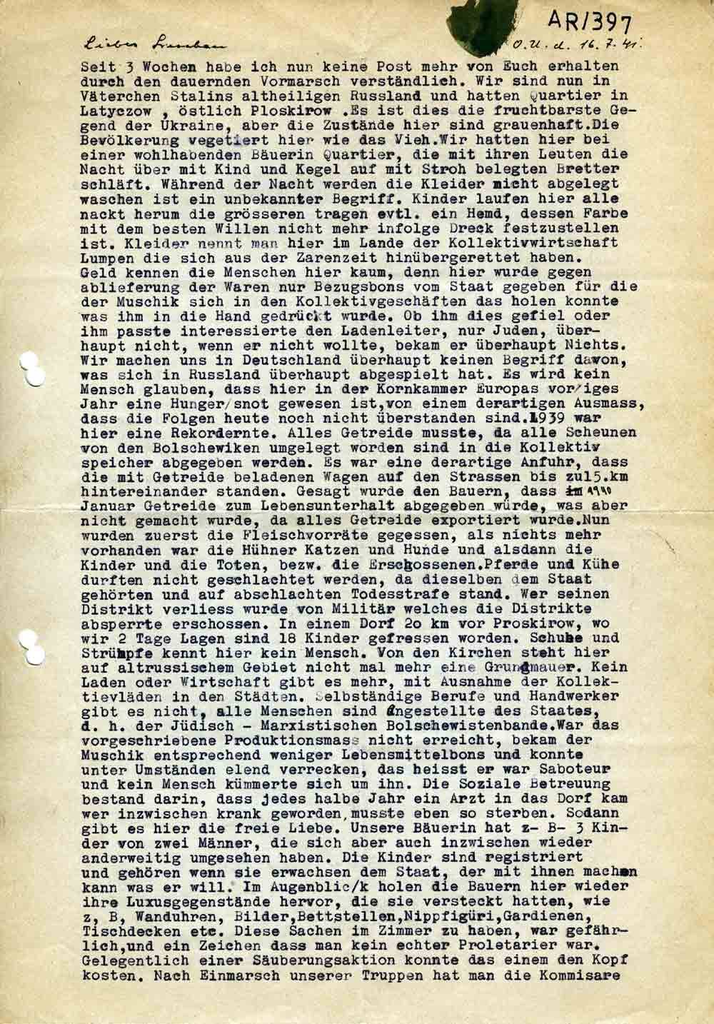 Seit 3 Wochen habe ich nun keine Post mehr von Euch erhalten durch den dauernden Vormarsch verständlich. Wir sind nun in Väterchen Stalins altheiligen Russland und hatten Quartier in Latyczow, östlich Ploskirow. Es ist dies die fruchtbarste Gegend der Ukraine, aber die Zustände hier sind grauenhaft. Die Bevölkerung vegetiert hier wie das Vieh. Wir hatten hier bei einer wohlhabenden Bäuerin Quartier, die mit ihren Leuten die Nacht über mit Kind und Kegel auf mit Stroh belegten Bretter schläft. Während der Nacht werden die Kleider nicht abgelegt waschen ist ein unbekannter Begriff. Kinder laufen hier alle nackt herum die grösseren tragen evtl. ein Hemd, dessen Farbe mit dem besten Willen nicht mehr infolge Dreck festzustellen ist. Kleider nennt man hier im Lande der Kollektivwirtschaft Lumpen die sich aus der Zarenzeit hinübergerettet haben. Geld kennen die Menschen hier kaum, denn hier wurde gegen ablieferung der Waren nur Bezugsbons vom Staat gegeben für die der Muschik sich in den Kollektivgeschäften das holen konnte was ihm in die Hand gedrückt wurde. Ob ihm dieses gefiel oder ihm passte interessierte den Ladenleiter, nur Juden, überhaupt nicht, wenn er nicht wollte, bekam er überhaupt Nichts. Wir machen uns in Deutschland überhaupt keinen Begriff davon, was sich in Russland überhaupt abgespielt hat. Es wird kein Mensch glauben, dass hier in der Kornkammer Europas voriges Jahr eine Hungersnot gewesen ist, von einem derartigen Ausmass, dass die Folgen heute noch nicht überstanden sind. 1939 war hier eine Rekordernte. Alles Getreide musste, da alle Scheunen von den Bolschewiken umgelegt worden sind in die Kollektivspeicher abgegeben werden. Es war eine derartige Anfuhr, dass die mit Getreide beladenen Wagen auf den Strassen bis zu 15 km hintereinander standen. Gesagt wurde den Bauern, dass 1940 Januar Getreide zum Lebensunterhalt abgegeben würde, was aber nicht gemacht wurde, da alles Getreide exportiert wurde. Nun wurden zuerst die Fleischvorräte gegessen, als nichts mehr vorhanden war die Hühner Katzen und Hunde und alsdann die Kinder und die Toten, bezw. die Erschossenen. Pferde und Kühe durften nicht geschlachtet werden, da dieselben dem Staat gehörten und auf abschlachten Todesstrafe stand. Wer seinen Distrikt verliess wurde von Militär welches die Distrikte absperrte erschossen. In einem Dorf 20 km vor Proskirow, wo wir 2 Tage Lagen sind 18 Kinder gefressen worden. Schuhe und Strümpfe kennt hier kein Mensch. Von den Kirchen steht hier auf altrussischem Gebiet nicht mal mehr eine Grundmauer. Kein Laden oder Wirtschaft gibt es mehr, mit Ausnahme der Kollektievläden in den Städten. Selbständige Berufe und Handwerker gibt es nicht, alle Menschen sind Angestellte des Staates, d. h. der Jüdisch-Marxistischen Bolschewistenbande. War das vorgeschriebene Produktionsmass nicht erreicht, bekam der Muschik entsprechend weniger Lebensmittelbons und konnte unter Umständen elend verrecken, das heisst er war Saboteur und kein Mensch kümmerte sich um ihn. Die Soziale Betreuung bestand darin, dass jedes halbe Jahr ein Arzt in das Dorf kam wer inzwischen krank geworden, musste eben so sterben. Sodann gibt es hier die freie Liebe. Unsere Bäuerin hat z- B- 3 Kinder von zwei Männer, die sich aber auch inzwischen wieder anderweitig umgesehen haben. Die Kinder sind registriert und gehören wenn sie erwachsen dem Staat, der mit ihnen machen kann was er will. Im Augenblick holen die Bauern hier wieder ihre Luxusgegenstände hervor, die sie versteckt hatten, wie z. B. Wanduhren, Bilder, Bettstellen, Nippfigüri, Gardienen, Tischdecken etc. Diese Sachen im Zimmer zu haben, war gefährlich, und ein Zeichen dass man kein echter Proletarier war. Gelegentlich einer Säuberungsaktion konnte das einem den Kopf kosten. Nach Einmarsch unserer Truppen hat man die Kommisare