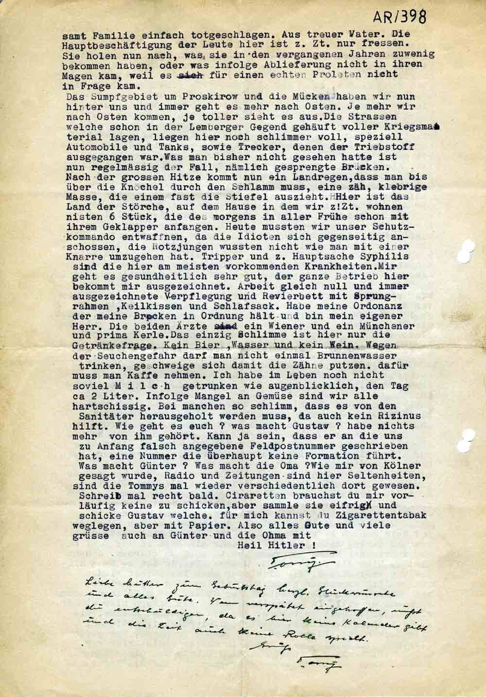 Das Sumpfgebiet um Proskirow und die Mücken haben wir nun hinter uns und immer geht es mehr nach Osten. Je mehr wir nach Osten kommen, je toller sieht es aus. Die Strassen welche schon in der Lemberger Gegend gehäuft voller Kriegsmaterial lagen, liegen hier noch schlimmer voll, speziell Automobile und Tanks, sowie Trecker, denen der Treibstoff ausgegangen war. Was man bisher nicht gesehen hatte ist nun regelmässig der Fall, nämlich gesprengte Brücken. Nach der grossen Hitze kommt nun ein Landregen, dass man bis über die Knöchel durch den Schlamm muss, eine zäh, klebrige Masse, die einem fast die Stiefel auszieht. Hier ist das Land der Störche, auf dem Hause in dem wir z. Zt. wohnen nisten 6 Stück, die des morgens in aller Frühe schon mit ihrem Geklapper anfangen. Heute mussten wir unser Schutzkommando entwaffnen, da die Idioten sich gegenseitig anschossen, die Rotzjungen wussten nicht wie man mit einer Knarre umzugehen hat. Tripper und z. Hauptsache Syphilis sind die hier am meisten vorkommenden Krankheiten. Mir geht es gesundheitlich sehr gut, der ganze Betrieb hier bekommt mir ausgezeichnet. Arbeit gleich null und immer ausgezeichnete Verpflegung und Revierbett mit Sprungrahmen, Keilkissen und Schlafsack. Habe meine Ordonanz der meine Brocken in Ordnung hält und bin mein eigener Herr. Die beiden Ärzte ein Wiener und ein Münchener und prima Kerle. Das einzig Schlimme ist hier nur die Getränkefrage. Kein Bier, Wasser und kein Wein. Wegen der Seuchengefahr darf man nicht immer Brunnenwasser trinken, geschweige sich damit die Zähne putzen. dafür muss man Kaffe nehmen. Ich habe im Leben noch nicht soviel Milch getrunken wie augenblicklich, den Tag ca 2 Liter. Infolge Mangel an Gemüse sind wir alle hartschissig. Bei manchen so schlimm, dass es von den Sanitäter herausgeholt werden muss, da auch kein Rizinus hilft. Wie geht es euch? was macht Gustav? habe nichts mehr von ihm gehört. Kann ja sein, dass er an die uns zu Anfang falsch angegebene Feldpostnummer geschrieben hat, eine Nummer die überhaupt keine Formation führt. Was macht Günter? Was macht die Oma? Wie mir von Kölner gesagt wurde, Radio und Zeitungen sind hier Seltenheiten, sind die Tommys mal wieder verschiedentlich dort gewesen. Schreib mal recht bald. Ciraretten brauchst du mir vorläufig keine zu schicken, aber sammle sie eifrig und schicke Gustav welche. für mich kannst du Zigarettentabak weglegen, aber mit Papier. Also alles Gute und viele grüsse auch an Günter und die Ohma mit