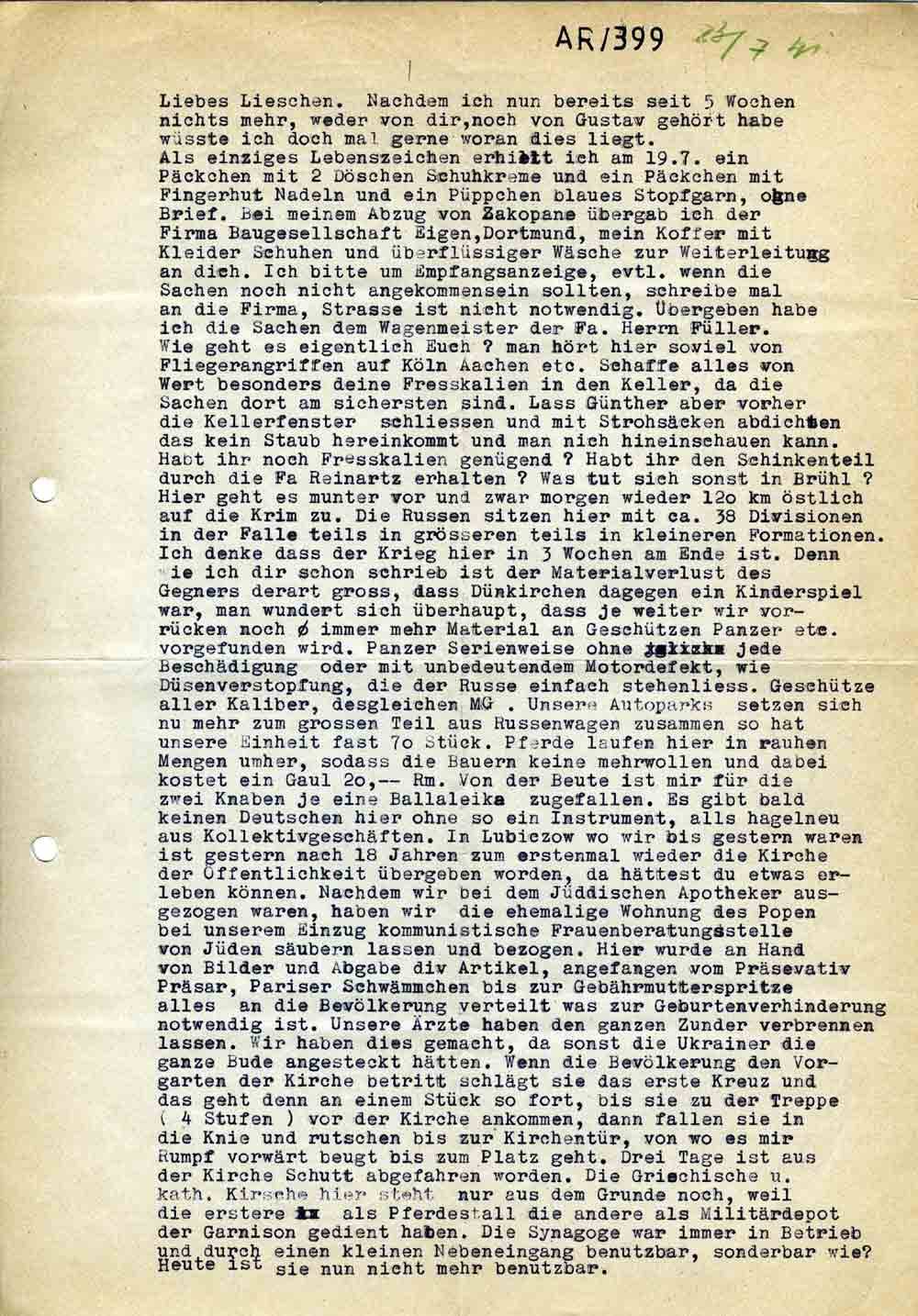 Als einziges Lebenszeichen erhielt ich am 19.7. ein Päckchen mit 2 Döschen Schuhkreme und ein Päckchen mit Fingerhut Nadeln und ein Püppchen blaues Stopfgarn, ohne Brief. Bei meinem Abzug von Zakopane übergab ich der Firma Baugesellschaft Eigen, Dortmund, mein Koffer mit Kleider Schuhen und überflüssiger Wäsche zur Weiterleitung an dich. Ich bitte um Empfangsanzeige, evtl. wenn die Sachen noch nicht angekommen sein sollten, schreibe mal an die Firma, Strasse ist nicht notwendig. Übergeben habe ich die Sachen dem Wagenmeister der Fa. Herrn Füller. Wie geht es eigentlich Euch? man hört hier soviel von Fliegerangriffen auf Köln Aachen etc. Schaffe alles von Wert besonders deine Fresskalien in den Keller, da die Sachen dort am sichersten sind. Lass Günther aber vorher die Kellerfenster schliessen und mit Strohsäcken abdichten das kein Staub hereinkommt und man nicht hineinschauen kann. Habt ihr noch Fresskalien genügend? Habt ihr den Schinkenteil durch die Fa Reinartz erhalten? Was tut sich sonst in Brühl? Hier geht es munter vor und zwar morgen wieder 120 km östlich auf die Krim zu. Die Russen sitzen hier mit ca. 38 Divisionen in der Falle teils in grösseren teils in kleineren Formationen. Ich denke dass der Krieg hier in 3 Wochen am Ende ist. Denn wie ich dir schon schrieb ist der Materialverlust des Gegners derart gross, dass Dünkirchen dagegen ein Kinderspiel war, man wundert sich überhaupt, dass je weiter wir vorrücken noch immer mehr Material an Geschützen Panzer etc. vorgefunden wird. Panzer Serienweise ohne jede Beschädigung oder mit unbedeutendem Motordefekt, wie Düsenverstopfung, die der Russe einfach stehenliess. Geschütze aller Kaliber, desgleichen MG. Unsere Autoparks setzen sich nunmehr zum grossen Teil aus Russenwagen zusammen so hat unsere Einheit fast 70 Stück. Pferde laufen hier in rauhen Mengen umher, sodass die Bauern keine mehr wollen und dabei kostet ein Gaul 20,-- Rm. Von der Beute ist mir für die zwei Knaben je eine Ballaleika zugefallen. Es gibt bald keine Deutschen hier ohne so ein Instrument, alle nagelneu aus Kollektivgeschäften. In Lubiczow wo wir bis gestern waren ist gestern nach 18 Jahren zum erstenmal wieder die Kirche der Öffentlichkeit übergeben worden, da hättest du etwas erleben können. Nachdem wir bei dem Jüddischen Apotheker ausgezogen waren, haben wir die ehemalige Wohnung des Popen bei unserem Einzug kommunistische Frauenberatungsstelle von Juden säubern lassen und bezogen. Hier wurde an Hand von Bilder und Abgabe div. Artikel, angefangen vom Präsevativ Präsar, Pariser Schwämmchen bis zur Gebährmutterspritze alles an die Bevölkerung verteilt war zur Geburtenverhinderung notwendig ist. Unsere Ärzte haben den ganzen Zunder verbrennen lassen. Wir haben dies gemacht, da sonst die Ukrainer die ganze Bude angesteckt hätten. Wenn die Bevölkerung den Vorgarten der Kirche betritt schlägt sie das erste Kreuz und das geht denn an einem Stück so fort, bis sie zu der Treppe (4 Stufen) vor der Kirche ankommen, dann fallen sie in die Knie und rutschen bis zur Kirchentür, von wo es mir Rumpf vorwärt beugt bis zum Platz geht. Drei Tage ist aus der Kirche Schutt abgefahren worden. Die Griechische u. kath. Kirche hier steht nur aus dem Grunde noch, weil die erstere als Pferdestall die andere als Militärdepot der Garnison gedient haben. Die Synagoge war immer in Betrieb und durch einen kleinen Nebeneingang benutzbar, sonderbar wie? Heute ist sie nun nicht mehr benutzbar,