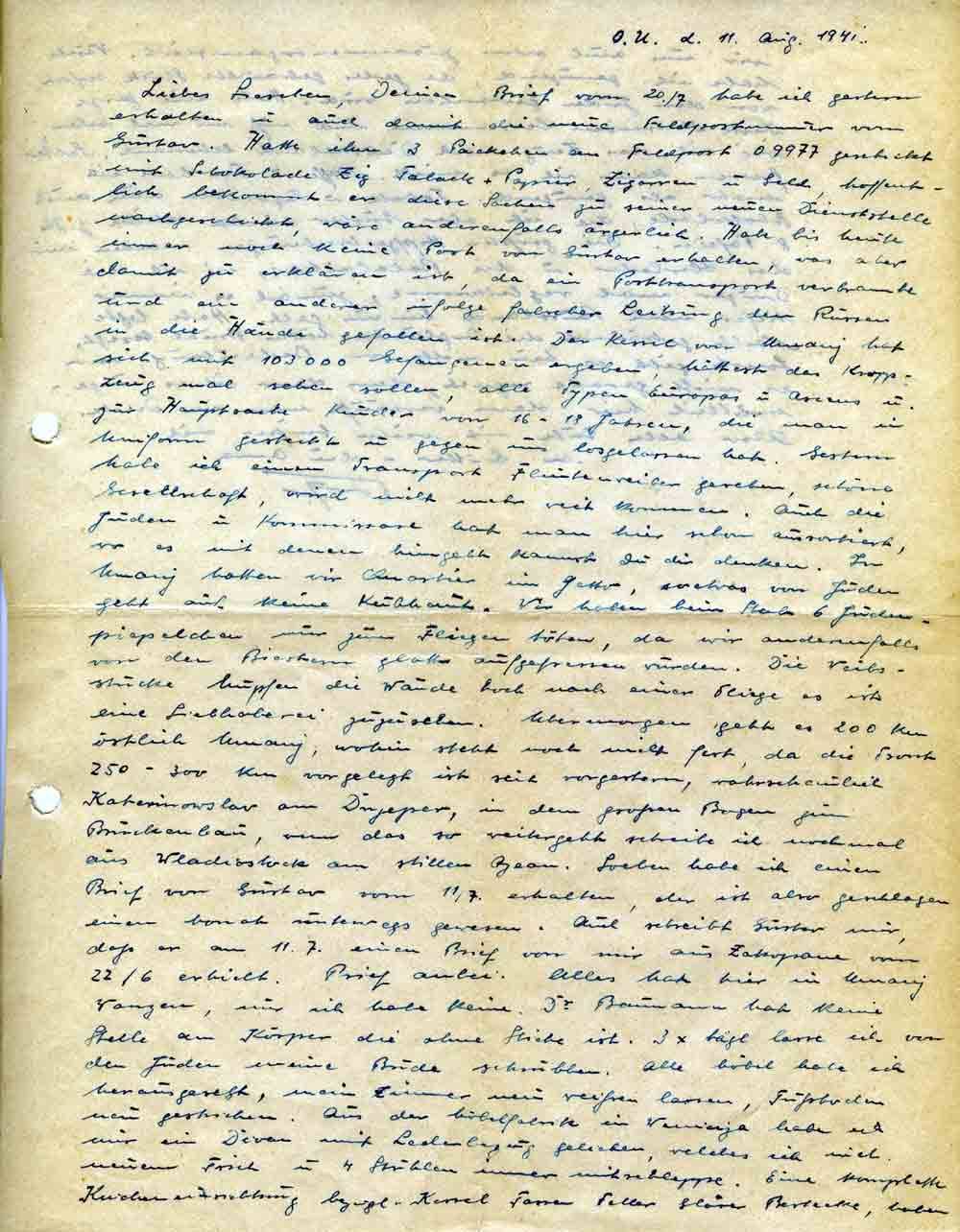 Liebes Lieschen, Deinen Brief vom 20/7. habe ich gestern erhalten u. auch damit die neue Feldpostnummer vom Gustav. Hatte ihm 3 Päckchen an Feldpost 09977 geschickt mit Schokolade Zig. Taback + Papier, Zigarren u. Geld, hoffentlich bekommt er diese Sachen zu seiner neuen Dienststelle nachgeschickt, wäre anderenfalls ärgerlich. Habe bis heute immer noch keine Post von Gustav erhalten, was aber damit zu erklären ist, da ein Posttransport verbrannte und ein anderer infolge falscher Leitung den Russen in die Hände gefallen ist. Der Kessel von Umanj hat sich mit 103000 Gefangenen ergeben, hättest das Kroppzeug mal sehen sollen, alle Typen Europas u. Asiens u. zur Hauptsache Kinder von 16-18 Jahren, die man in Uniform gesteckt u. gegen uns losgelassen hat. Gestern habe ich einen Transport Flintenweiber gesehen, schöne Gesellschaft, wird nicht mehr weit kommen. Auch die Juden u. Kommissare hat man hier schon aussortiert, wo es mit denen hingeht kannst Du dir denken. In Umanj hatten wir Quartier im Getto, soetwas von Juden geht auf keine Kuhhaut. Wir haben beim Stab 6 Judenpiepelchen nur zum Fliegen töten, da wir andernfalls von den Biestern glatt aufgefressen würden. Die Weibsstücke hüpfen die Wände hoch nach einer Fliege es ist eine Liebhaberei zuzusehen. Übermorgen geht es 200 km östlich Umanj, wohin steht noch nicht fest, da die Front 250-300 km vorgelegt ist seit vorgestern, wahrscheinlich Katerinowslav am Dnjeper , in dem großen Bogen zum Brückenbau, wenn das so weitergeht schreibe ich nochmal aus Wladiostock am stillen Ozean. Soeben habe ich einen Brief von Gustav vom 11/7. erhalten, der ist also geschlagen einen Monat unterwegs gewesen. Auch schreibt Gustav mir, daß er am 11.7. einen Brief von mir aus Zakopane vom 22/6. erhielt. Brief anbei. Alles hat hier in Umanj Wanzen, nur ich habe keine. Dr. Baumann hat keine Stelle am Körper die ohne Stiche ist. 3 x tägl. lasse ich von den Juden meine Bude schrubben. Alle Möbel habe ich herausgesetzt, mein Zimmer neu weißen lassen, Fußboden neu gestrichen. Aus der Möbelfabrik in Wenierja habe ich mir ein Divan mit Lederbezug geliehen, welches ich mit neuem Tisch u. 4 Stühlen immer mitschleppe. Eine komplette Kücheneinrichtung bezügl. Kessel Tassen Teller Gläser Bestecke, haben