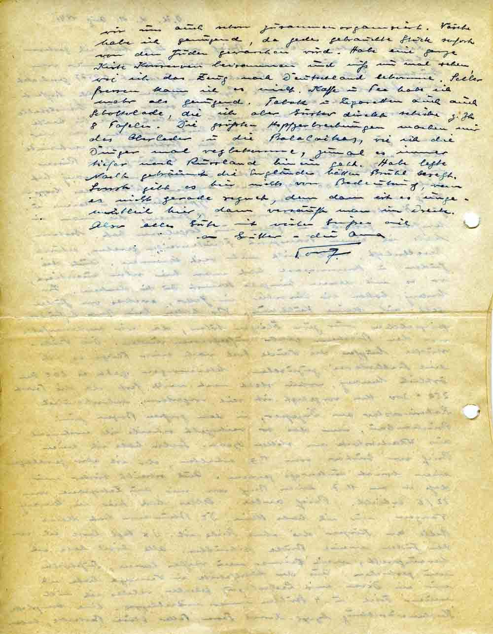 wir uns auch schon zusammenorganisiert. Wäsche habe ich genügend, da jedes gebrauchte Stück sofort von den Juden gewaschen wird. Habe eine ganze Kiste Konserven beisammen und muß nun mal sehen, wie ich das Zeug nach Deutschland bekomme. Selber fressen kann ich es nicht. Kaffe u. Tee habe ich mehr als genügend. Tabak u. Zigaretten auch auch Schokolade, die ich aber Gustav direkt schicke z. Zt. 8 Tafeln. Die größten Kopfzerbrechen machen mir das Oberleder u. die Balalaikas, wie ich die Dinger mal wegbekomme, zumal es immer tiefer nach Russland hinein geht. Habe letzte Nacht geträumt die Engländer hätten Brühl besetzt. Sonst gibt es hier nichts von Bedeutung, wenn es nicht gerade regnet, denn dann ist es ungemütlich hier, dann versäuft man im Dreck. Also alles Gute mit vielen Grüßen auch an Günther u. die Oma