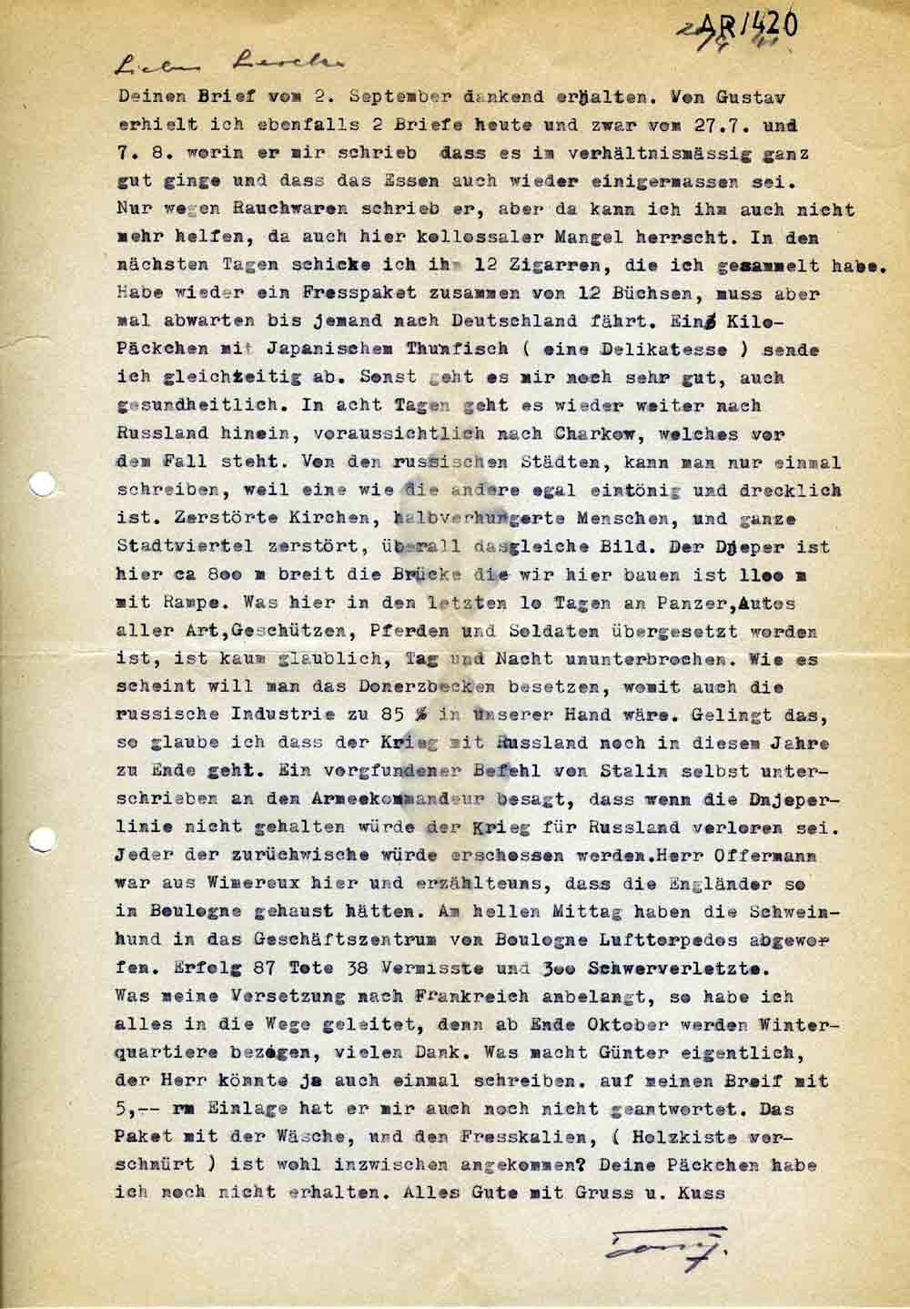 Deinen Brief vom 2. September dankend erhalten. Von Gustav erhielt ich ebenfalls 2 Briefe heute und zwar vom 27.7. und 7.8. worin er mir schrieb dass es im verhältnismässig ganz gut ginge und dass das Essen auch wieder einigermassen sei. Nur wegen Rauchwaren schrieb er, aber da kann ich ihm auch nicht mehr helfen, da auch hier kollossaler Mangel herrscht. In den nächsten Tagen schicke ich ihm 12 Zigarren, die ich gesammelt habe. Habe wieder ein Fresspaket zusammen von 12 Büchsen, muss aber mal abwarten bis jemand nach Deutschland fährt. Ein Kilo-Päckchen mit Japanischem Thunfisch (eine Delikatesse) sende ich gleichzeitig ab. Sonst geht es mir noch sehr gut, auch gesundheitlich. In acht Tagen geht es wieder weiter nach Russland hinein, voraussichtlich nach Charkow, welches vor dem Fall steht. Von den russischen Städten, kann man nur einmal schreiben, weil eine wie die andere egal eintönig und drecklich ist. Zerstörte Kirchen, halbverhungerte Menschen, und ganze Stadtviertel zerstört, überall das gleiche Bild. Der Dnjeper ist hier ca 800 m breit die Brücke die wir hier bauen ist 1100 m mit Rampe. Was hier in den letzten 10 Tagen an Panzer, Autos aller Art, Geschützen, Pferden und Soldaten übersetzt worden ist, ist kaum glaublich, Tag und Nacht ununterbrochen. Wie es scheint will man das Donerzbecken besetzen, womit auch die russische Industrie zu 85 % in unserer Hand wäre. Gelingt das, so glaube ich dass der Krieg mit Russland noch in diesem Jahre zu Ende geht. Ein vorgefundener Befehl von Stalin selbst unterschrieben an den Armeekommandeur besagt, dass wenn die Dnjeperlinie nicht gehalten würde der Krieg für Russland verloren sei. Jeder der zurückwische würde erschossen werden. Herr Offermann war aus Wimereux hier und erzählte uns, dass die Engländer so in Boulogne gehaust hätten. Am hellen Mittag haben die Schweinhund in das Geschäftszentrum von Boulogne Lufttorpedos abgeworfen. Erfolg 87 Tote 38 Vermisste und 300 Schwerverletzte.