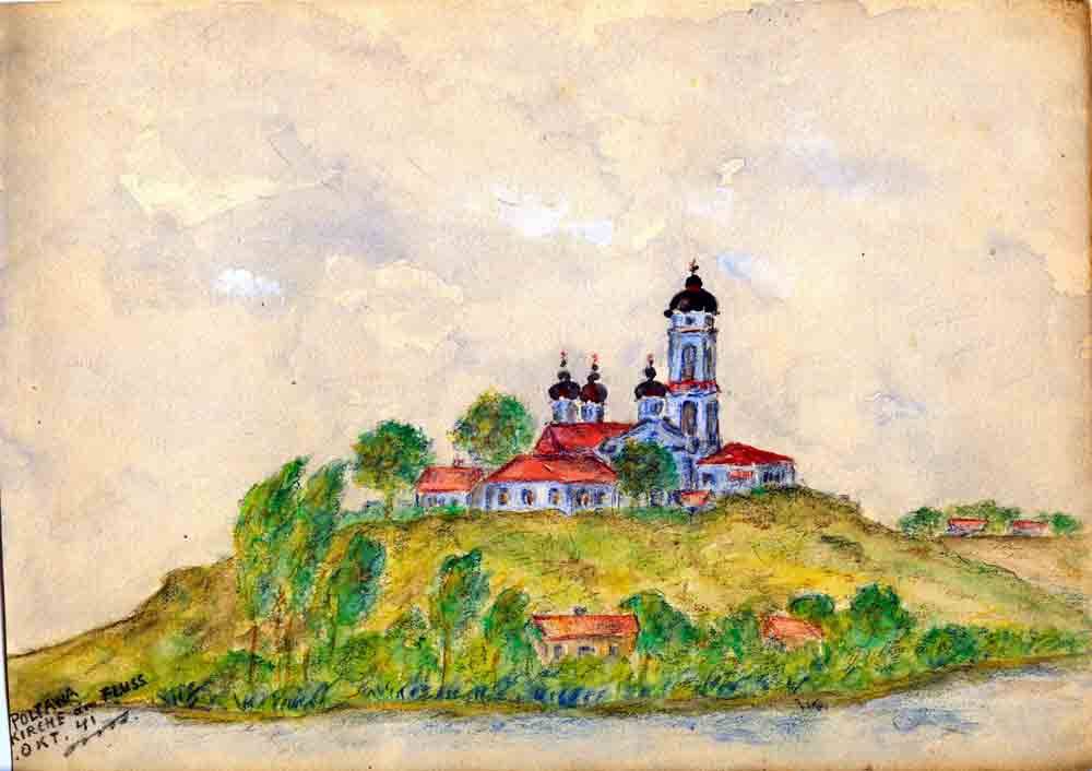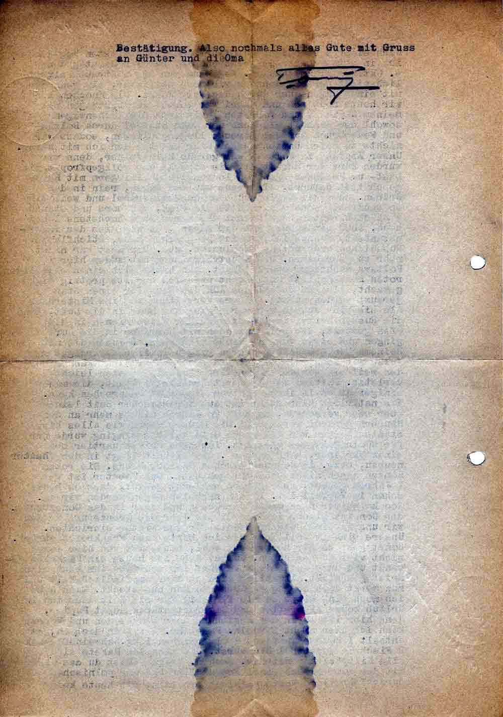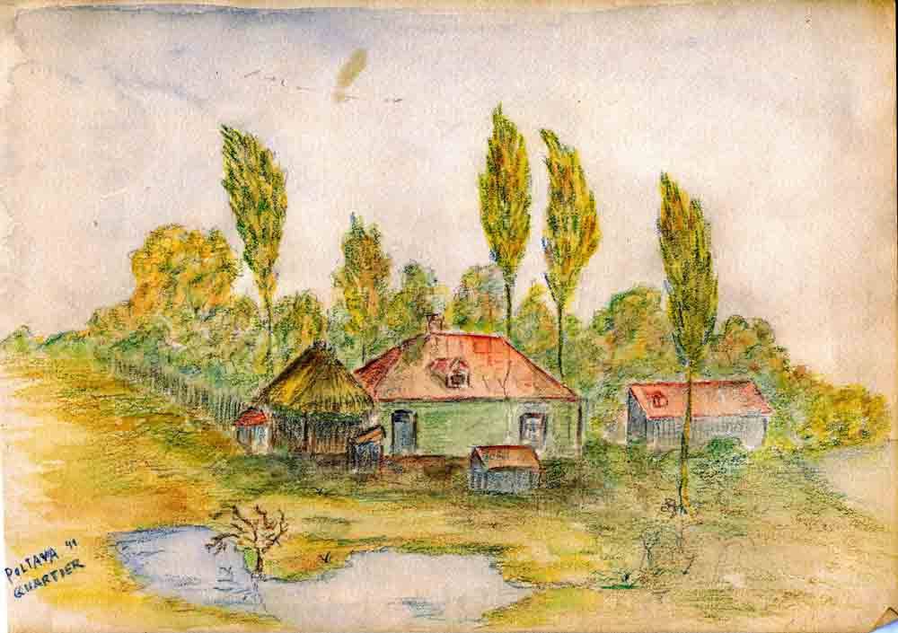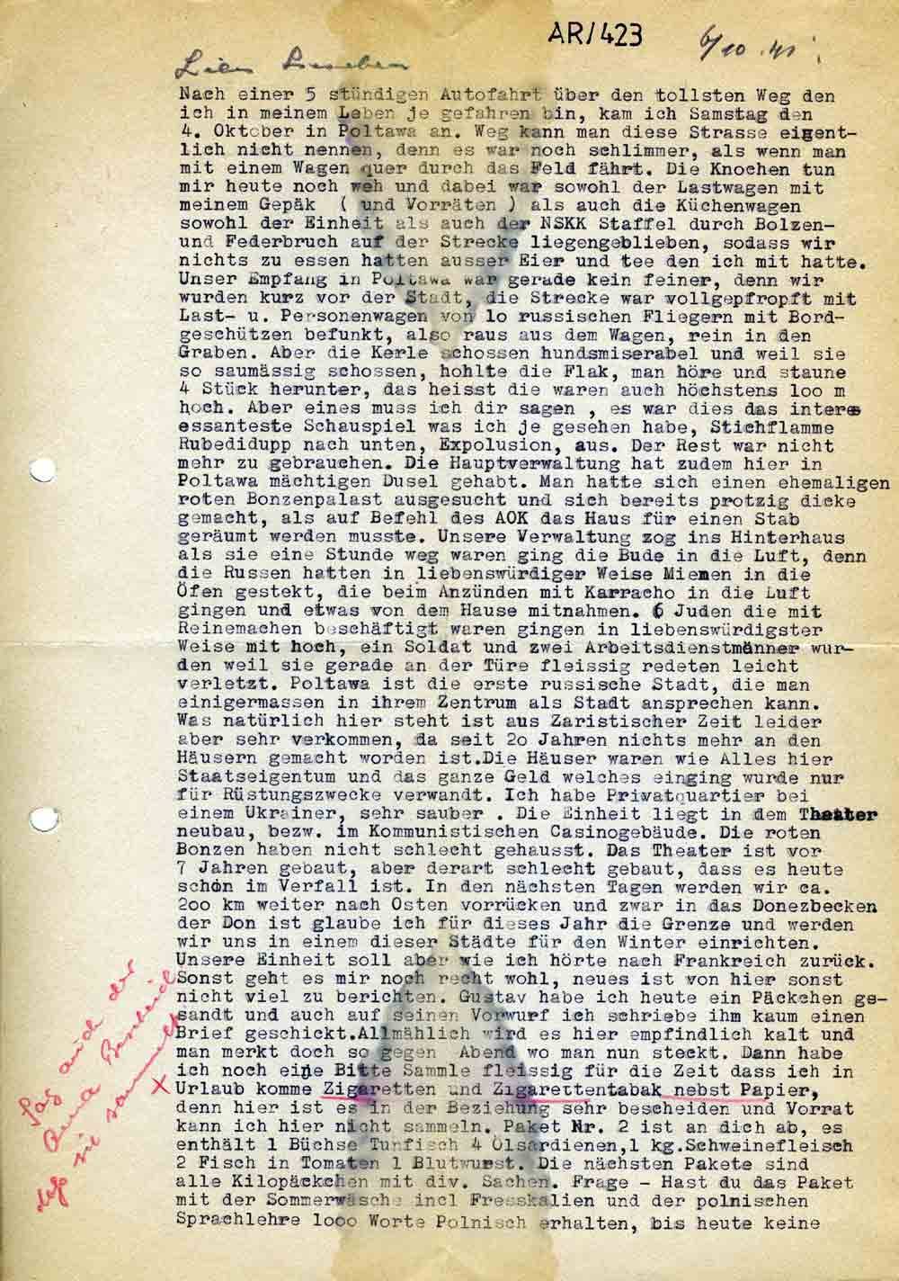 Nach einer 5 stündigen Autofahrt über den tollsten Weg den ich in meinem Leben je gefahren bin, kam ich Samstag den 4. Oktober in Poltawa an. Weg kann man diese Strasse eigentlich nicht nennen, denn es war noch schlimmer, als wenn man mit einem Wagen quer durch das Feld fährt. Die Knochen tun mir heute noch weh und dabei war sowohl der Lastwagen mit meinem Gepäck (und Vorräten) als auch die Küchenwagen sowohl der Einheit als auch der NSKK Staffel durch Bolzen- und Federbruch auf der Strecke liegengeblieben, sodass wir nichts zu essen hatten ausser Eier und tee den ich mit hatte. Unser Empfang in Poltawa war gerade kein feiner, denn wir wurden kurz vor der Stadt, die Strecke war vollgepfropft mit Last- und Personenwagen von 10 russischen Fliegern mit Bordgeschützen befunkt, also raus aus dem Wagen, rein in den Graben. Aber die Kerle schossen hundsmiserabel und weil sie so saumässig schossen, hohlte die Flak, man höre und staune 4 Stück herunter, das heisst die waren auch höchstens 100 m hoch. Aber eines muss ich dir sagen, es war dies das interessanteste Schauspiel was ich je gesehen habe, Stichflamme Rubedidupp nach unten, Expolusion, aus. Der Rest war nicht mehr zu gebrauchen. Die Hauptverwaltung hat zudem hier in Poltawa mächtigen Dusel gehabt. Man hatte sich einen ehemaligen roten Bonzenpalast ausgesucht und sich bereits protzig dicke gemacht, als auf Befehl des AOK das Haus für einen Stab geräumt werden musste. Unsere Verwaltung zog ins Hinterhaus als sie eine Stunde weg waren ging die Bude in die Luft, denn die Russen hatten in liebenswürdiger Weise Mienen in die Öfen gestekt, die beim Anzünden mit Karracho in die Luft gingen und etwas von dem Hause mitnahmen. 6 Juden die mit Reinemachen beschäftigt waren gingen in liebenswürdigster Weise mit hoch, ein Soldat und zwei Arbeitsdienstmänner wurden weil sie gerade an der Türe fleissig redeten leicht verletzt. Poltawa ist die erste russische Stadt, die man einigermassen in ihrem Zentrum als Stadt ansprechen kann. Was natürlich hier steht ist aus Zaristischer Zeit leider aber sehr verkommen, da seit 20 Jahren nichts mehr an den Häusern gemacht worden ist. Die Häuser waren wie Alles hier Staatseigentum und das ganze Geld welches einging wurde nur für Rüstungszwecke verwandt. Ich habe Privatquartier bei einem Ukrainer, sehr sauber. Die Einheit liegt in dem Theaterneubau, bezw. im Kommunistischen Casinogebäude. Die roten Bonzen haben nicht schlecht gehausst. Das Theater ist vor 7 Jahren gebaut, aber derart schlecht gebaut, dass es heute schon im Verfall ist. In den nächsten Tagen werden wir ca. 200 km weiter nach Osten vorrücken und zwar in das Donezbecken. der Don ist glaube ich für dieses Jahr die Grenze und werden wir uns in einem dieser Städte für den Winter einrichten. Unsere Einheit soll aber wie ich hörte nach Frankreich zurück. Sonst geht es mir noch recht wohl, neues ist von hier sonst nicht viel zu berichten. Gustav habe ich heute ein Päckchen gesandt und auch auf seinen Vorwurf ich schriebe ihm kaum einen Brief geschickt. Allmählich wird es hier empfindlich kalt und man merkt doch so gegen Abend wo man nun steckt. Dann habe ich noch eine Bitte Sammle fleissig für die Zeit dass ich in Urlaub komme Zigaretten und Zigarettentabak nebst Papier, denn hier ist es in der Beziehung sehr bescheiden und Vorrat kann ich hier nicht sammeln. Sag auch der Oma Bescheid, daß sie sammelt. Paket Nr. 2 ist an dich ab, es enthält 1 Büchse Tunfisch 4 Ölsardinen, 1 kg. Schweinefleisch 2 Fisch in Tomaten 1 Blutwurst. Die nächsten Pakete sind alle Kilopäckchen mit div. Sachen. Frage – Hast du das Paket mit der Sommerwäsche incl Fresskalien und der polnischen Sprachlehre 1000 Worte Polnisch erhalten, bis heute keine