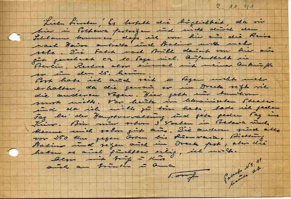 Liebes Lieschen! Es besteht die Möglichkeit, da wir hier in Poltowa festsitzen und nicht durch den Schlamm kommen, daß ich von hier aus die Reise nach Hause antrete und Stalino nicht mehr sehe. Die Fahrt nach Brühl dauert von hier aus gut gerechnet ca. 10 Tage incl. Aufenthalt in Berlin. Rechne also einmal mit meiner Ankunft so um den 25. herum.