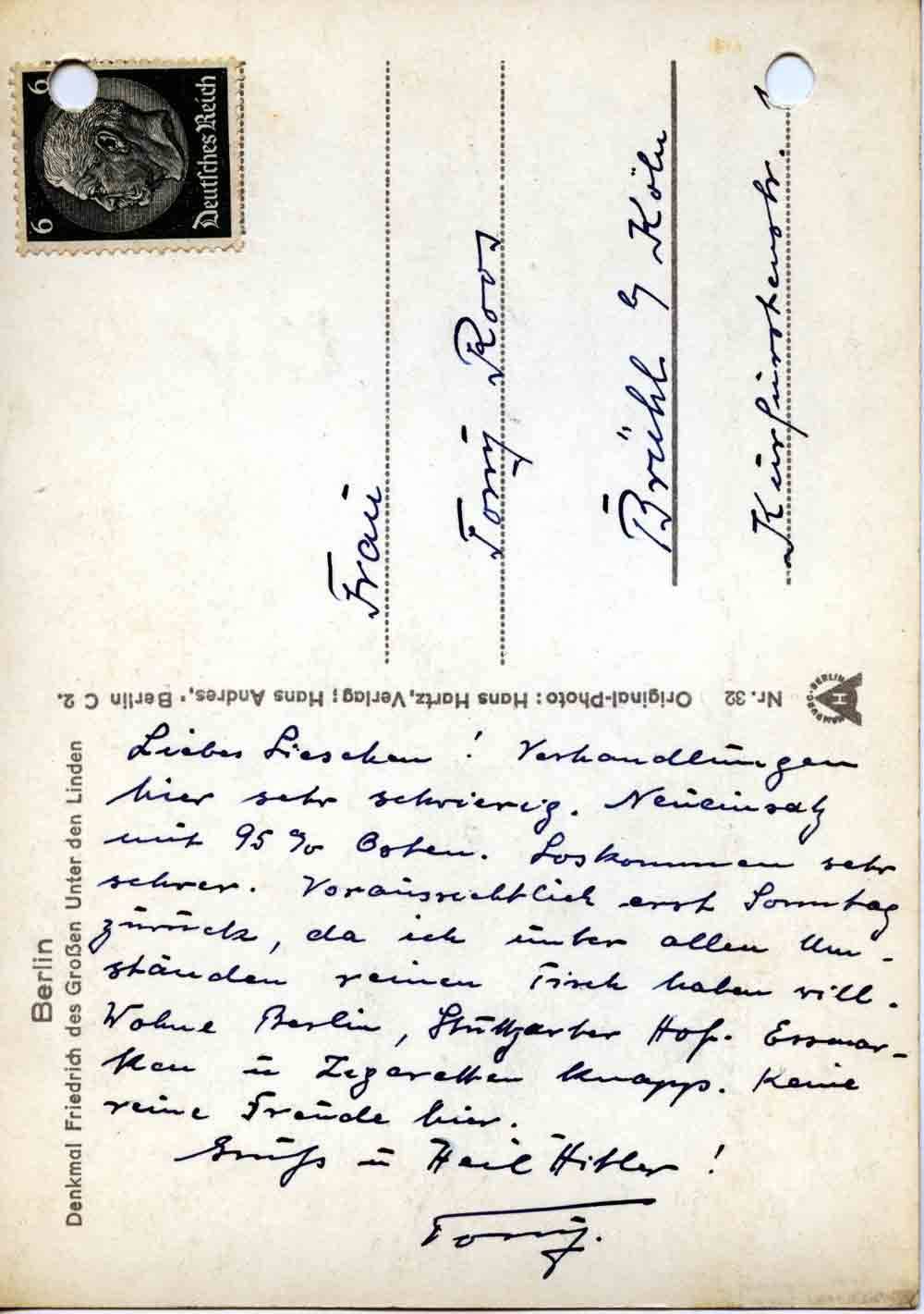 Liebes Lieschen! Verhandlungen hier sehr schwierig. Neueinsatz mit 95 % Osten. Loskommen sehr schwer. Voraussichtlich erst Sonntag zurück, da ich unter allen Umständen reinen Tisch haben will. Wohne Berlin, Stuttgarter Hof. Essmarken u. Zigaretten knapp. Keine reine Freude hier.