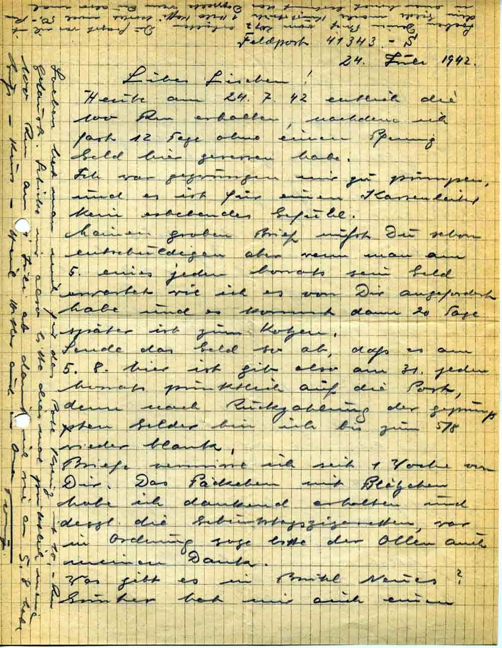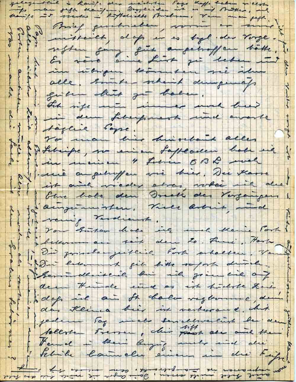 Soeben Deinen Brief vom 20/7. erhalten. Du fragst was ich mit dem Gelde mache Kunststück 1 Kilo Kaffe kostet noch 50,- Rm in einem Monat bestimmt das Doppelte wenn Du also mal gelegentlich im Laufe der nächsten Tage Kaffe haben willst muß man jetzt kaufen. Desgleichen ist es mit Butter, ich kaufe und schicke in luftdichte Büchsen. Wenn man jetzt nicht für den Winter sorgt ist man im Winter aufgeschmissen zudem kann man auch Geld nicht essen. Deine Angst ich würde hier das Geld verprassen ist unangebracht. Also nochmals Gruß
