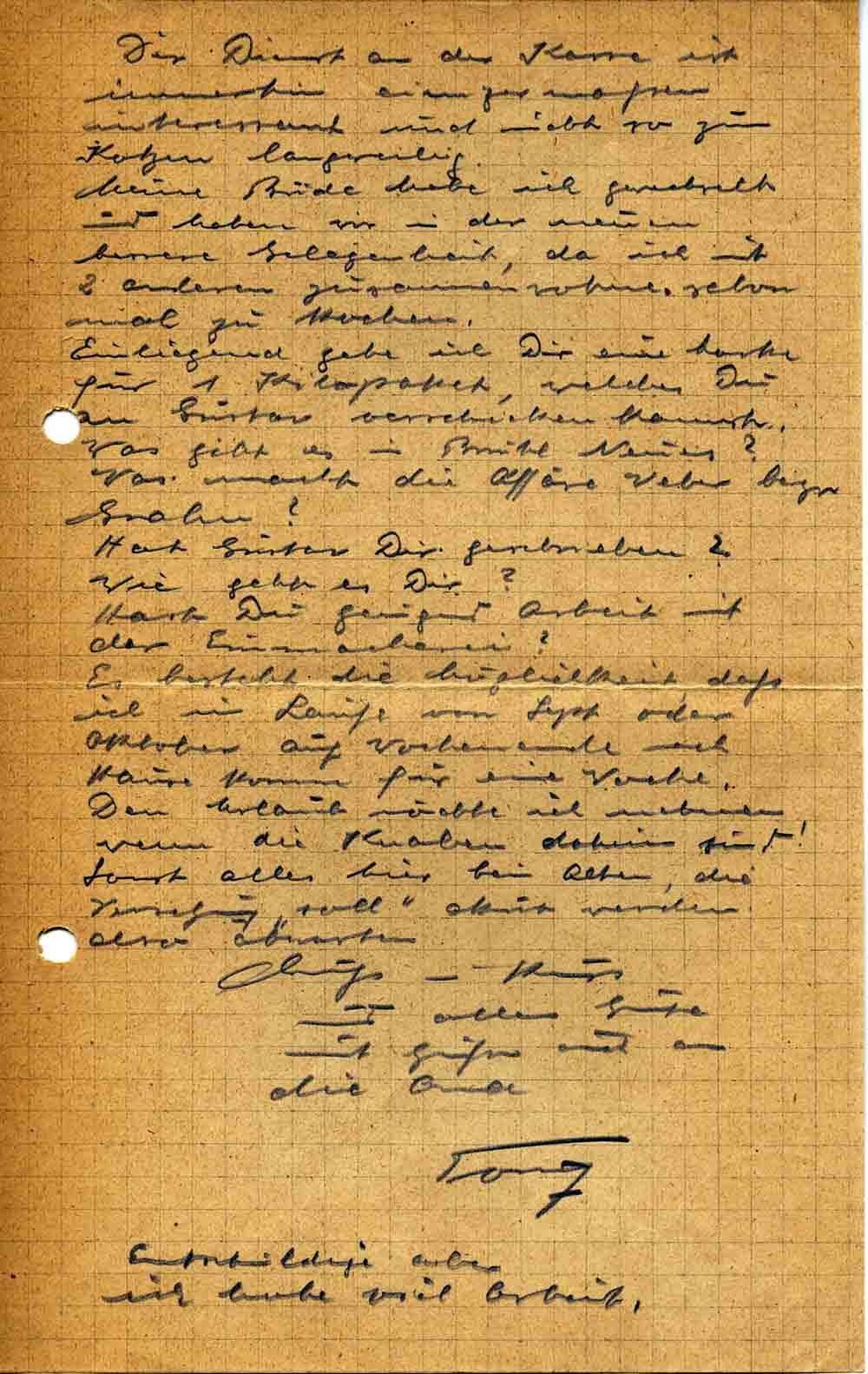Einliegend gebe ich Dir eine Marke für 1 Kilopaket, welches Du an Gustav verschicken kannst. Was gibt es in Brühl Neues? Was macht die Affäre Weber bezw. Grahn?