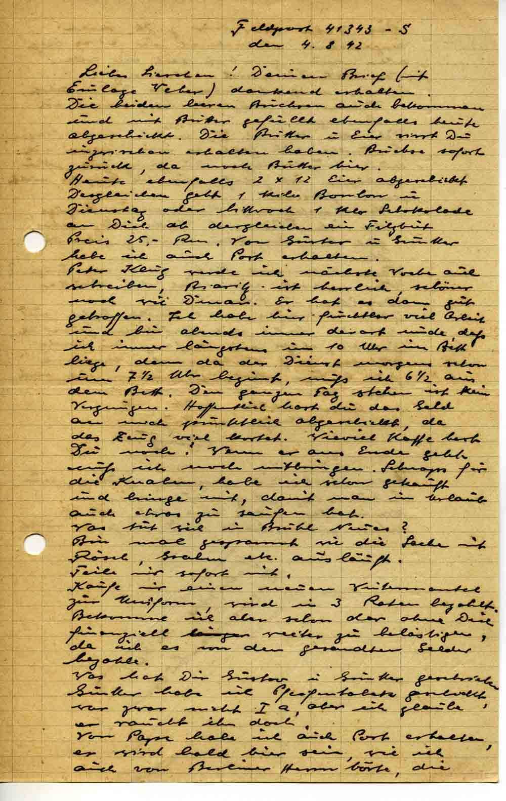 Heute ebenfalls 2x12 Eier abgeschickt. Desgleichen geht 1 Kilo Bonbon u. Dienstag oder Mittwoch 1 klo Schokolade an Dich ab dergleichen ein Filzhut Preis 25,- Rm. Von Gustav u. Günther habe ich auch Post erhalten.