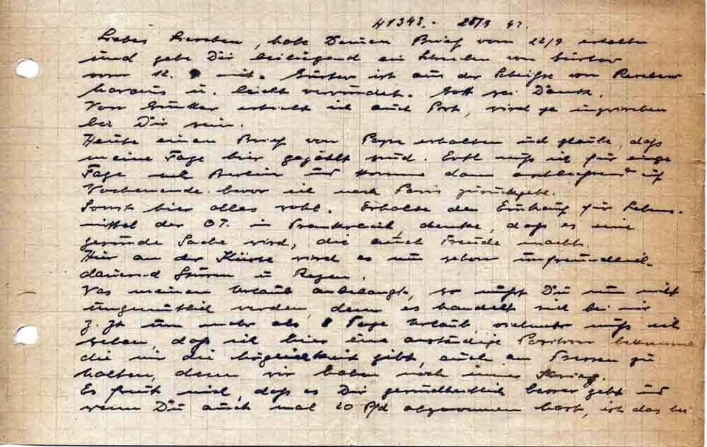 Liebes Lieschen, habe Deinen Brief vom 22/9. erhalten und gebe Dir beiliegend ein Schreiben von Gustav vom 12.9. mit. Gustav ist aus der Scheiße von Reschew heraus u. leicht verwundet. Gott sei Dank. Von Günther erhielt ich auch Post, wird ja inzwischen bei Dir sein.