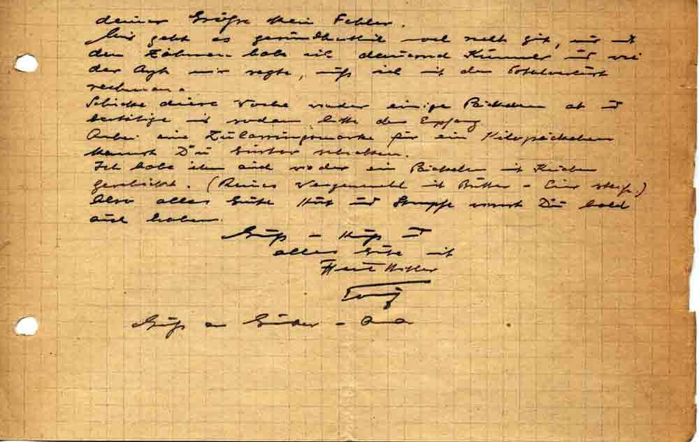Was meinen Urlaub anbelangt, so mußt Du nun nicht ungemütlich werden, denn es handelt sich bei mir z. Zt. um mehr als 8 Tage Urlaub, vielmehr muß ich sehen, daß ich hier eine anständige Position bekomme die mir die Möglichkeit gibt, euch am Fressen zu halten, denn wir haben noch immer Krieg.
