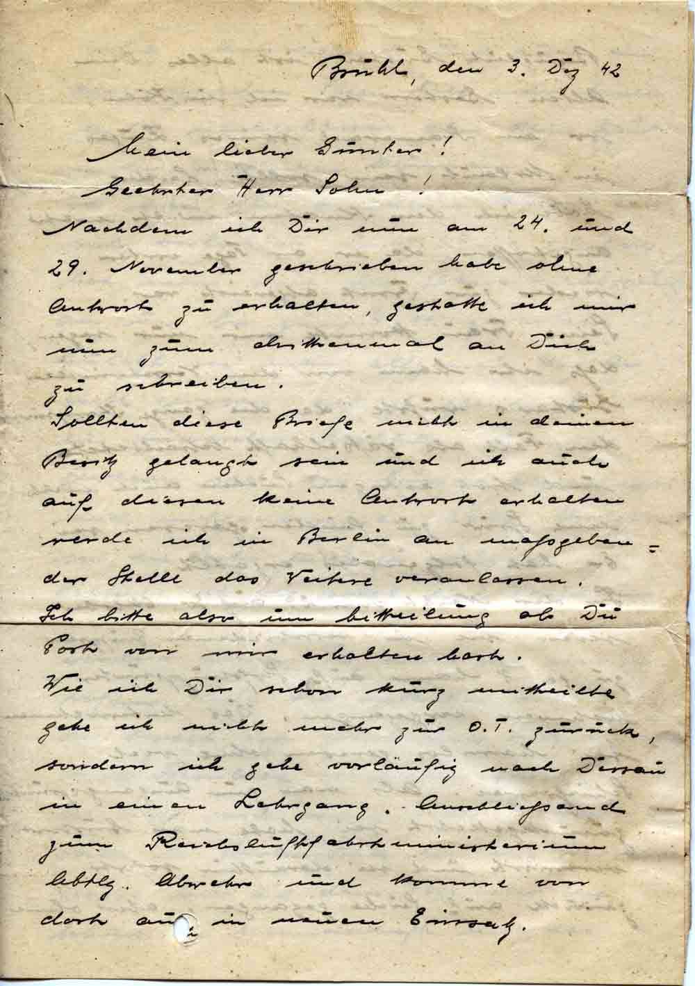 Sollten diese Briefe nicht in deinen Besitz gelangt sein und ich auch auf diesen keine Antwort erhalten werde ich in Berlin an maßgebender Stelle das Weitere veranlassen. Ich bitte also um Mitteilung ob Du Post von mir erhalten hast.