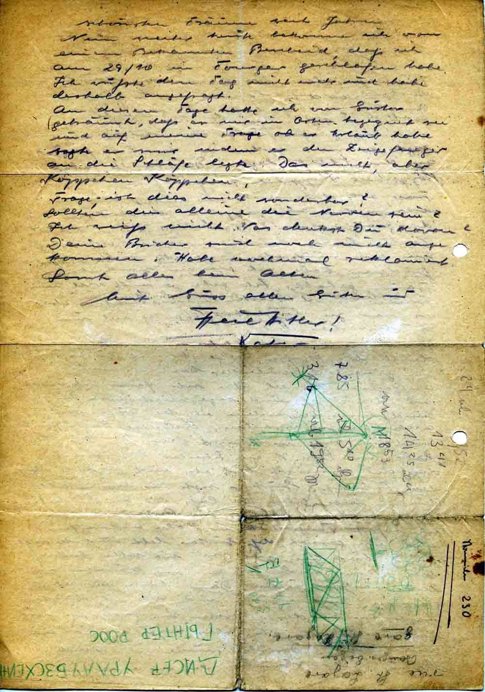 Ich muß Dir nun noch sagen, daß der Brief den ich Mutter geschrieben hatte um alles Unnötige hierbei noch zu vermeiden von Jupp an mich zurückdirigiert worden ist, Mutter also von der Verwundung Gustavs und der Überführung in ein russisches Lazarett nichts weiß. Zudem habe ich einen sonderbaren Traum gehabt. Ich gebe ja nicht viel um Träume und Kartenlegerweisheiten aber es war zu sonderbar, da es sich um Gustav handelte.