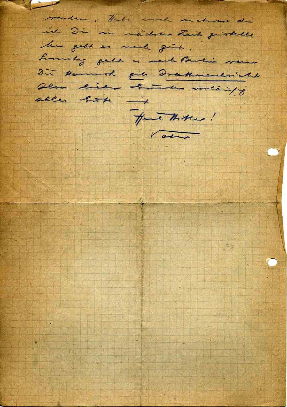 Was also inzwischen dort los ist, weiß ich nicht, hast Du etwas erfahren? Zeitungen u. [?] habe ich gestern an Dich durchgegeben. Hast Du erhalten? Hat Mutter Dir Geld geschickt? Habe ihr 2 x geschrieben, sie solle Dir 25,- Rm senden. Heute schicke ich einen alten Jugendband aus dem Jahre 1911 an Dich. Sehr interessant, besonders der Anzeigenteil. Kannst Dir mal ein Bild machen, was die Leute früher für Sorgen hatten wie üppige Büste etc.