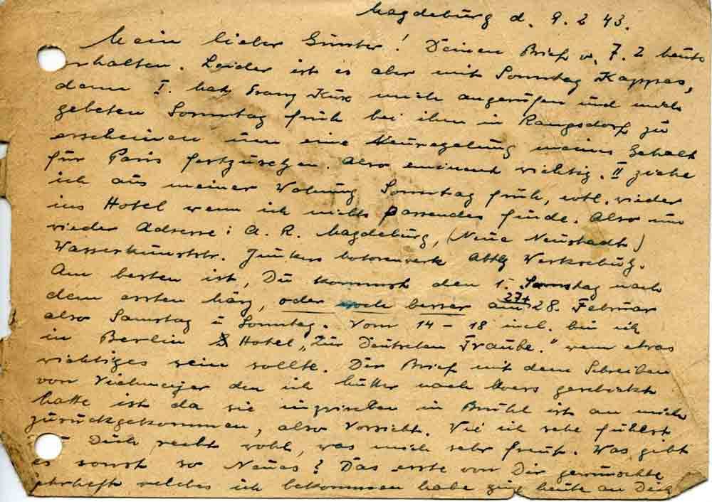 Mein lieber Günter! Deinen Brief v. 7.2. heute erhalten. Leider ist es aber mit Sonntag Kappes, denn I. hat Franz Kux mich angerufen und mich gebeten Sonntag früh bei ihm in Rangsdorf zu erscheinen um eine Neuregelung meines Gehalt für Paris festzusetzen. Also eminent wichtig. II ziehe ich aus meiner Wohnung Sonntag früh, evtl. wieder ins Hotel wenn ich nichts Passendes finde. Also nun wieder Adresse: A. R. Magdeburg, (Neue Neustadt) Wasserkunststr. Junkers Motorenwerk Abtlg. Werkschutz. Am besten ist, Du kommst den 1. Samstag nach dem ersten März, oder noch besser am 27 + 28. Februar also Samstag u. Sonntag. Vom 14-18 incl. bin ich in Berlin Hotel „Zur Deutschen Traube“ wenn etwas wichtiges sein sollte. Der Brief mit dem Schreiben von Vielmeyer den ich Mutter nach Moers geschickt hatte ist da sie inzwischen in Brühl ist an mich zurückgekommen, also Vorsicht. Wie ich sehe fühlst Du Dich recht wohl, was mich sehr freut. Was gibt es sonst so Neues? Das erste von Dir gewünschte Jahrheft welches ich bekommen habe ging heute an Dich.