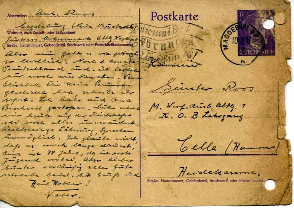 Also mir geht es wie gesagt so leidlich. Noch 2 Monate Deutschland und ich bestehe nur noch aus Knochen. Wenn Elisabeth Dir keine Penunsen geschickt hat, schreibe ihr sofort. Ich habe auch Oma Bescheid gestoßen. Mutter schrieb mir heute auf der Kirchstraße sei noch alles unverändert. Rechtsseitige Lähmung, Sprechen unmöglich. Ich glaube nicht, daß es noch lange dauert, Oma ist 78 Jahre, da ist erste Jugend vorbei. Also lieber Günter vorläufig alles Gute schreibe bald. Mit Gruß und
