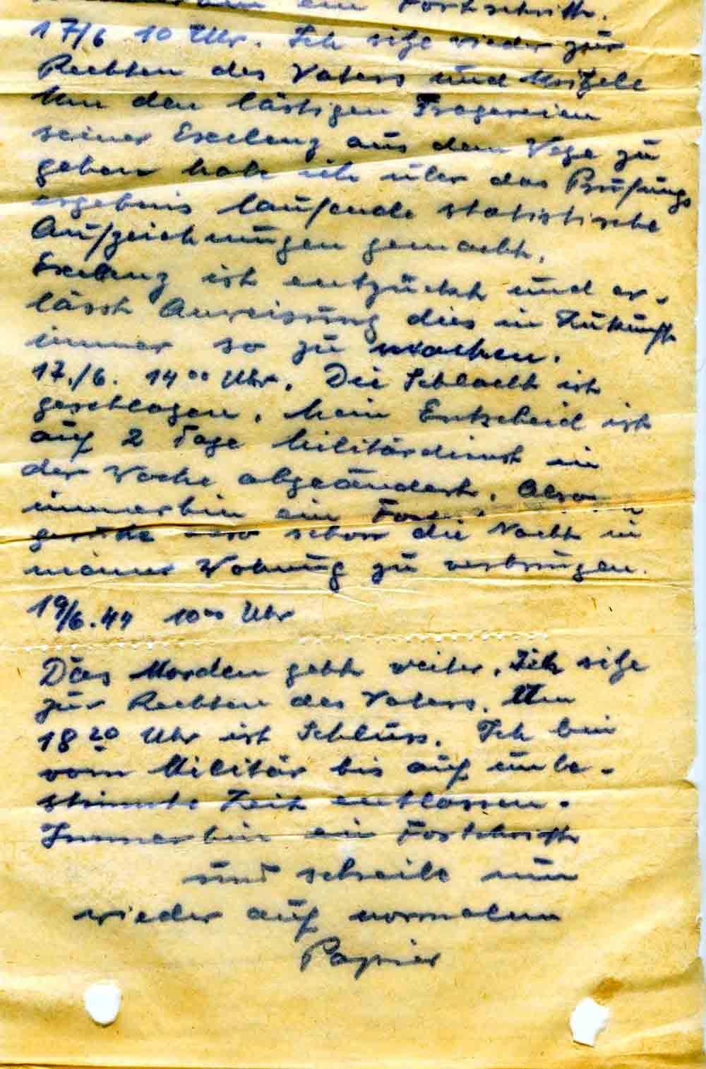 16./6. 19.30 Uhr Der Tag ist um ich habe für Heute ausgekritzelt und nebenbei erreicht, daß ich nur während der Nacht Soldat bin und am Tage als Zivilist ins Geschäft gehen kann, also immerhin ein Fortschritt.