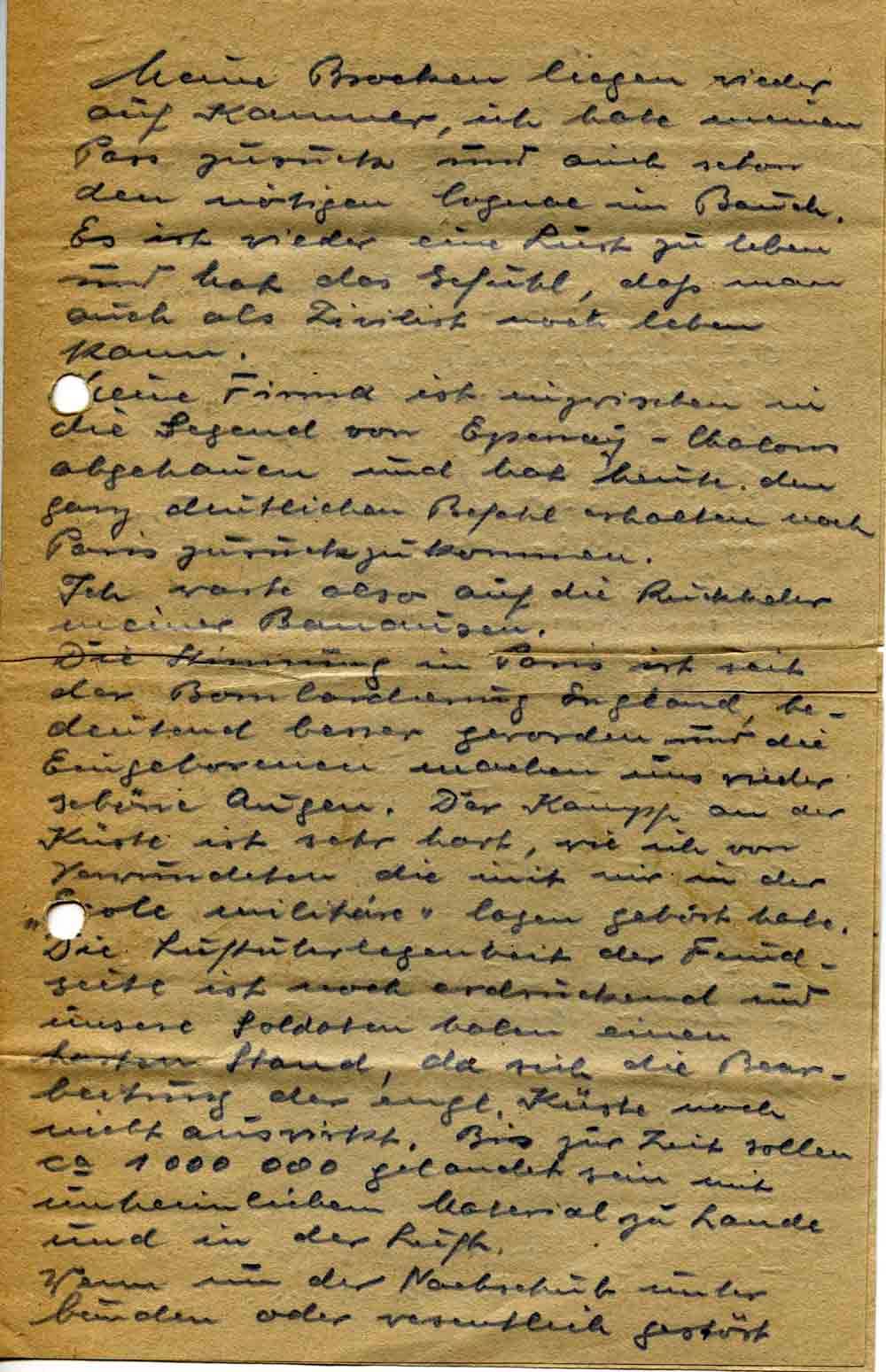 Die Stimmung in Paris ist seit der Bombardierung England, bedeutend besser geworden und die Eingeborenen machen uns wieder schöne Augen. Der Kampf an der Küste ist sehr hart, wie ich von Verwundeten die mit mir in der „Scole militáre“ lagen gehört habe. Die Luftüberlegenheit der Feindseite ist noch erdrückend und unsere Soldaten haben einen harten Stand, da sich die Bearbeitung der engl. Küste noch nicht auswirkt. Bis zur Zeit sollen ca. 1000000 gelandet sein mit unheimlichem Material zu Lande und in der Luft.
