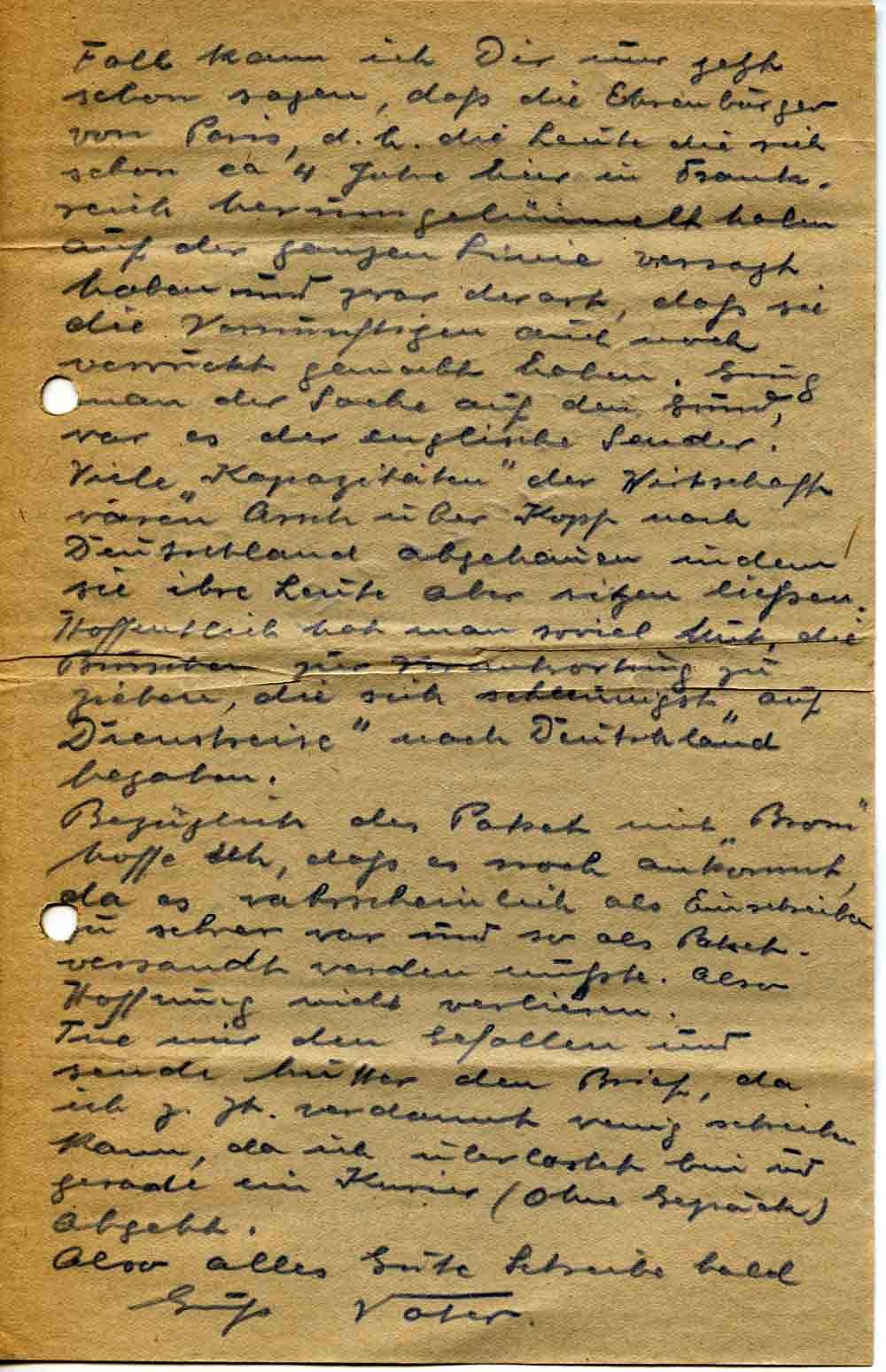 Fall kann ich Dir nur jetzt schon sagen, daß die Ehrenbürger von Paris, d. h. die Leute die sich schon ca. 4 Jahre hier in Frankreich herumgelümmelt haben auf der ganzen Linie versagt haben und zwar derart, daß sie die Vernünftigen auch noch verrückt gemacht haben. Ging man der Sache auf den Grund, war es der englische Sender! Viele „Kapazitäten“ der Wirtschaft waren Arsch über Kopf nach Deutschland abgehauen indem sie ihre Leute aber sitzen ließen. Hoffentlich hat man soviel Mut, die Burschen zur Verantwortung zu ziehen, die sich schleunigst „auf Dienstreise“ nach Deutschland begaben.