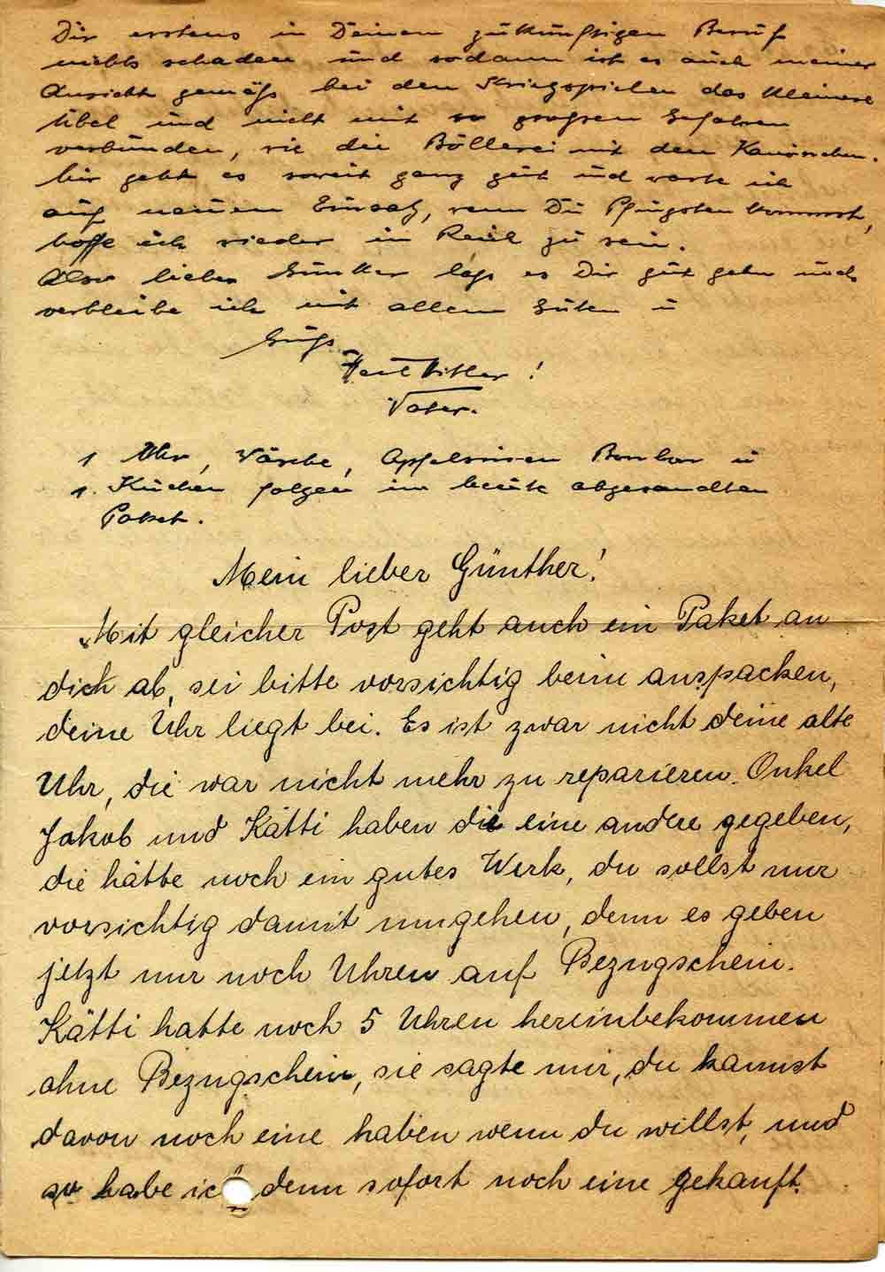 Mit gleicher Post geht auch ein Paket an dich ab, sei bitte vorsichtig beim auspacken, deine Uhr liegt bei. Es ist zwar nicht deine alte Uhr, die war nicht mehr zu reparieren. Onkel Jakob und Kätti haben dir eine andere gegeben, die hätte noch ein gutes Werk, du sollst nur vorsichtig damit umgehen, denn es geben jetzt nur noch Uhren auf Bezugschein. Kätti hatte noch 5 Uhren hereinbekommen ohne Bezugschein, sie sagte mir, du kannst davon noch eine haben wenn du willst, und so habe ich denn sofort noch eine gekauft.