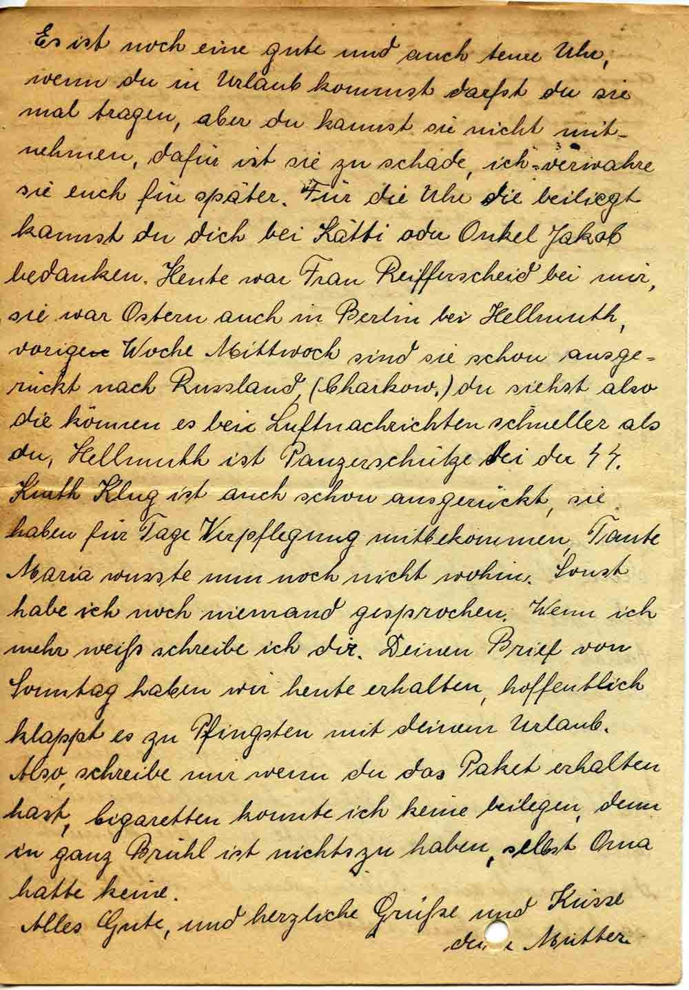 Es ist noch eine gute und auch teure Uhr, wenn du in Urlaub kommst darfst du sie mal tragen, aber du kannst sie nicht mitnehmen, dafür ist sie zu schade, ich verwahre sie euch für später. Für die Uhr die beiliegt kannst du dich bei Kätti oder Onkel Jakob bedanken. Heute war Frau Reifferscheid bei mir, sie war Ostern auch in Berlin bei Hellmuth, vorige Woche Mittwoch sind sie schon ausgerückt nach Russland (Chaikow.) du siehst also die können es bei Luftnachrichten schneller als du, Hellmuth ist Panzerschütze bei der SS. Kurth Klug ist auch schon ausgerückt, sie haben für Tage Verpflegung mitbekommen, Tante Maria wusste nun noch nicht wohin. Sonst habe ich noch niemand gesprochen. Wenn ich mehr weiß schreibe ich dir. Deinen Brief vom Sonntag haben wir heute erhalten, hoffentlich klappt es zu Pfingsten und deinem Urlaub. Also, schreibe mir wenn du das Paket erhalten hast, Cigaretten konnte ich keine beilegen, denn in ganz Brühl ist nichts zu haben, selbst Oma hatte keine.