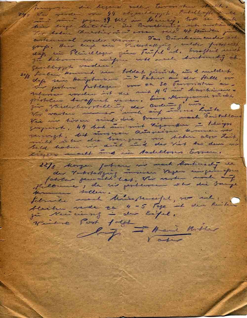 Gestern Abend sind die letzten von uns von Paris angekommen. Wie ich hörte ist die franz. Polizei von uns entwaffnet worden. Die Terroristen haben die Bahnhöfe gestürmt und alles was ihnen an Deutschen in den Weg kam über den Haufen geschossen. Zuletzt hat die SS die Säuberung der Strassen vorgenommen und wie man mir erzählte soll daraufhin wieder einigermassen Ordnung eingetreten sein.