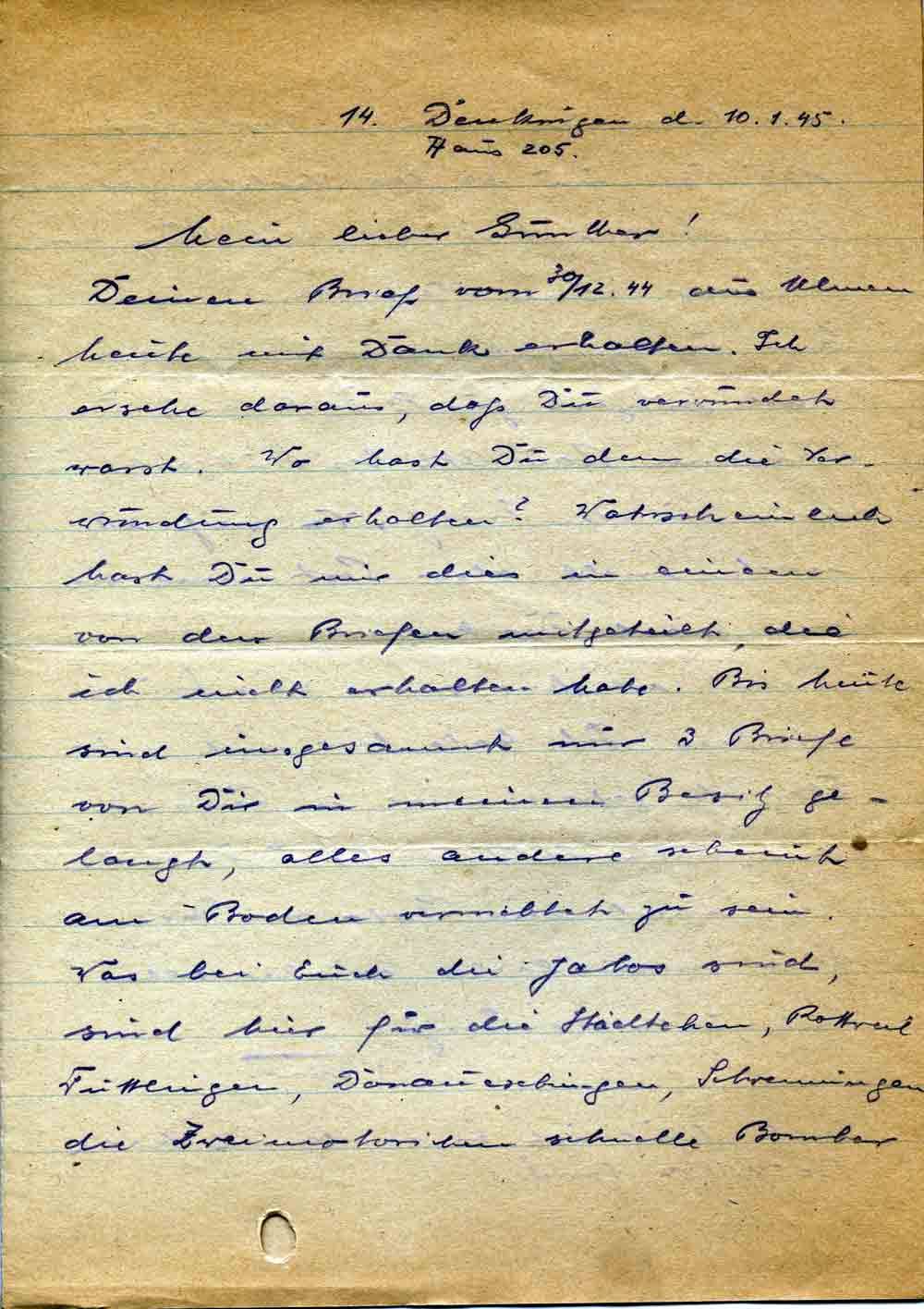 Deinen Brief vom 30/12.44 aus Ulmen heute mit Dank erhalten. Ich ersehe daraus, daß Du verwundet warst. Wo hast Du denn die Verwundung erhalten? Wahrscheinlich hast Du mir dies in einem von den Briefen mitgeteilt, die ich nicht erhalten habe. Bis heute sind insgesamt nur 3 Briefe von Dir in meinen Besitz gelangt, alles andere scheint am Boden vernichtet zu sein. Was bei Euch die Jabos sind, sind hier für die Städtchen, Rottweil, Tuttlingen, Donaueschingen, Schwenningen die Zweimotorischen schnelle Bomber.