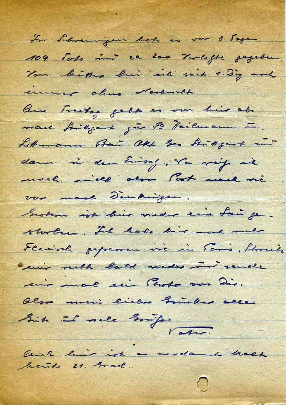 In Schwenningen hat es vor 8 Tagen 109 Tote und ca. 200 Verletzte gegeben. Von Mutter bin ich seit 1. Dez. noch immer ohne Nachricht.