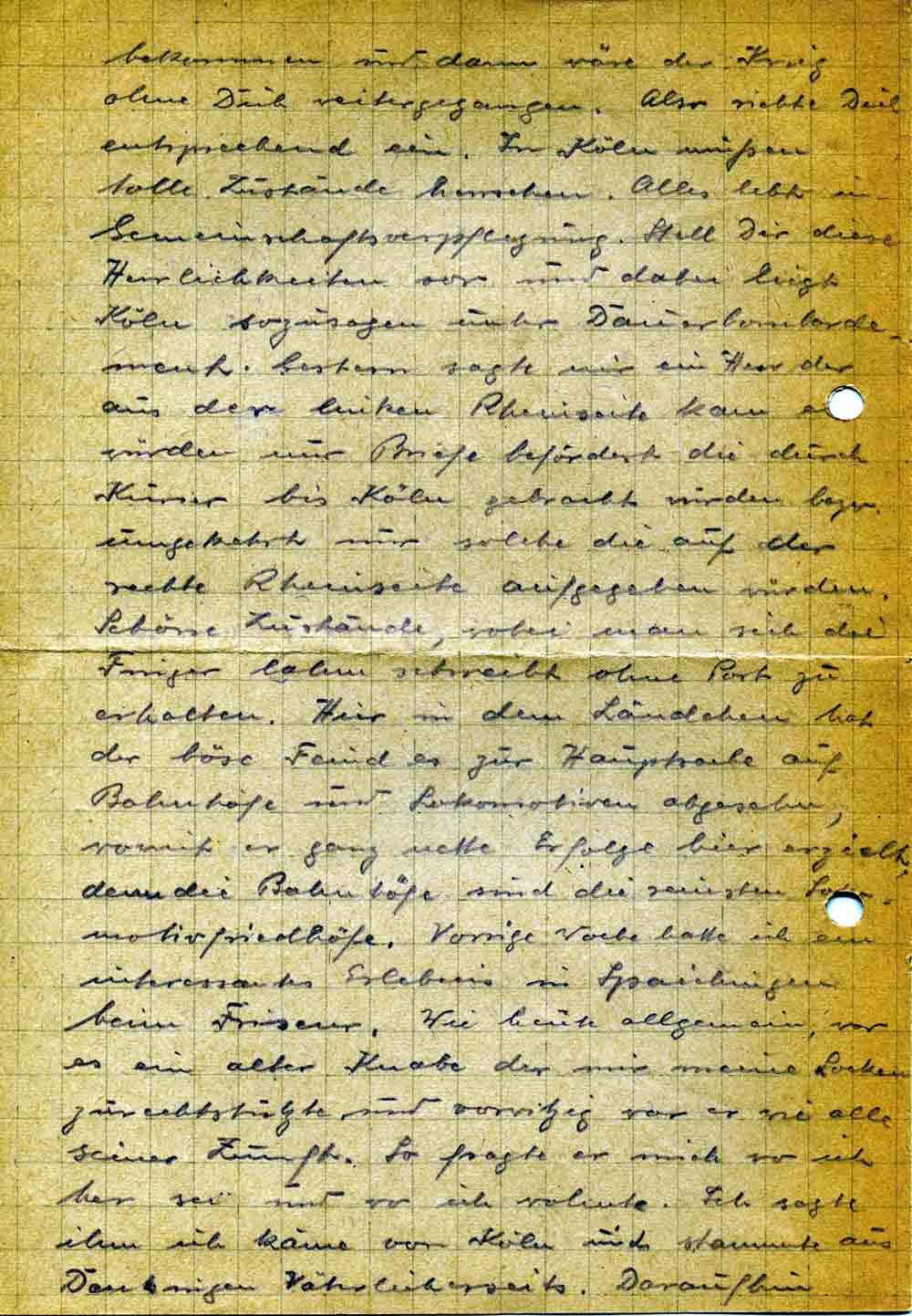 bekommen und dann wäre der Krieg ohne Dich weitergegangen. Also richte Dich entsprechend ein. In Köln müßen tolle Zustände herrschen. Alles lebt in Gemeinschaftsverpflegung. Stell Dir diese Herrlichkeiten vor und dabei liegt Köln sozusagen unter Dauerbombardement. Gestern sagte mir ein Herr der aus der linken Rheinseite kam es würden nur Briefe befördert die durch Kurier bis Köln gebracht würden bezw. umgekehrt nur solche die auf der rechte Rheinseite aufgegeben würden. Schöne Zustände, wobei man sich die Finger lahm schreibt ohne Post zu erhalten. Hier in dem Ländchen hat der böse Feind es zur Hauptsache auf Bahnhöfe und Lokomotiven abgesehn, womit er ganz nette Erfolge hier erzielt, denn die Bahnhöfe sind die reinsten Lokomotivfriedhöfe. Vorige Woche hatte ich ein interessantes Erlebnis in Spaichingen beim Friseur. Wie heute allgemein, war es ein alter Knabe der mir meine Locken zurechtstutzte und vorwitzig war er wie alle seiner Zunft. So fragte er mich wo ich her sei und wo ich wohnte. Ich sagte ihm ich käme von Köln und stammte aus Denkingen väterlicherseits. Daraufhin