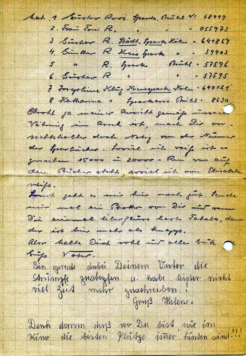 Zirkelkasten, Rechenschieber und Schrift[?] mit Regiment[=?] von Gustav habe ich hier zurückgelassen. Desgleichen 2 blaue Anzüge, ein grauer Anzug, eine graue Hose Hut, Schal und ein Karton mit diversen Kleinigkeiten wie Sockenhalter, Hosenträger Farbstifte u. Andenken von Gustav 2 Bilder Kupferstiche etc. Ich teile dir dies mit, damit Du es weißt. Sodann, da Du mir nicht den Empfang bestätigt hast gebe ich Dir nochmals die Nummern der Sparkassenbücher an, die Elisabeth in Brühl
