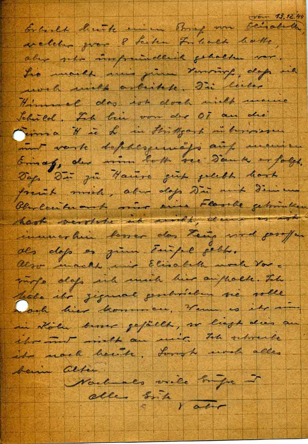 Also macht mir Elisabeth noch Vorwürfe daß ich mich hier aufhalte. Ich habe ihr zigmal geschrieben sie solle nach hier kommen. Wenn es ihr nun in Köln besser gefällt, so liegt dies an ihr und nicht an mir. Ich schreibe ihr noch heute. Sonst noch alles beim Alten.