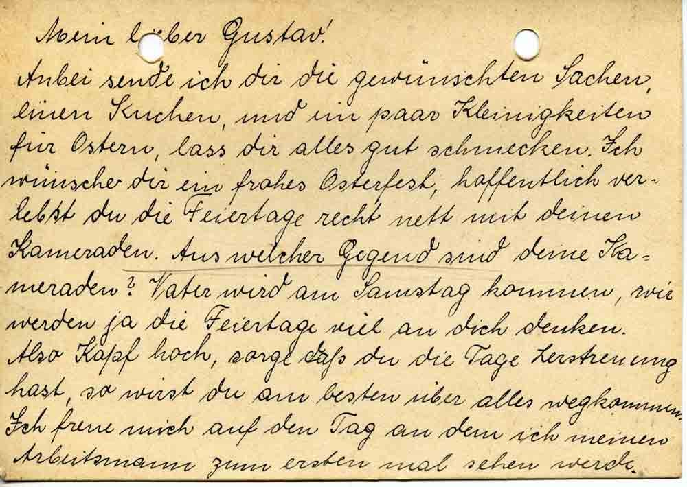 Anbei sende ich dir die gewünschten Sachen, einen Kuchen, und ein paar Kleinigkeiten für Ostern, lass dir alles gut schmecken. Ich wünsche dir ein frohes Osterfest, hoffentlich verlebst du die Feiertage recht nett mit deinen Kameraden. Aus welcher Gegend sind deine Kameraden? Vater wird am Samstag kommen, wir werden ja die Feiertage viel an dich denken. Also Kopf hoch, sorge daß du die Tage Zerstreuung hast, so wirst du am besten über alles wegkommen. Ich freue mich auf den Tag an dem ich meinen Arbeitsmann zum ersten mal sehen werde.