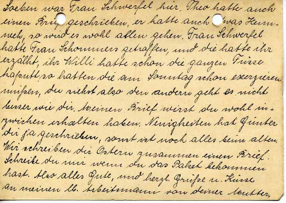 Soeben war Frau Schwerfel hier. Theo hatte auch einen Brief geschrieben, er hatte auch etwas Heimweh, so wird es wohl allen gehen. Frau Schwerfel hatte Frau Schommers getroffen, und die hatte ihr erzählt, ihr Willi hatte schon die ganzen Füsse kaputt, so hatten die am Sonntag schon exerzieren müßen, du siehst also den andern geht es nicht besser als dir. Meinen Brief wirst du wohl inzwischen erhalten haben. Neuigkeiten hat Günter dir ja geschrieben, sonst ist noch alles beim alten. Wir schreiben dir Ostern zusammen einen Brief. Schreibe du mir wenn du das Paket bekommen hast. Also alles Gute, und herzl. Grüße u. Küsse an meinen lb. Arbeitsmann von deiner Mutter.