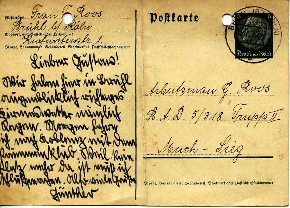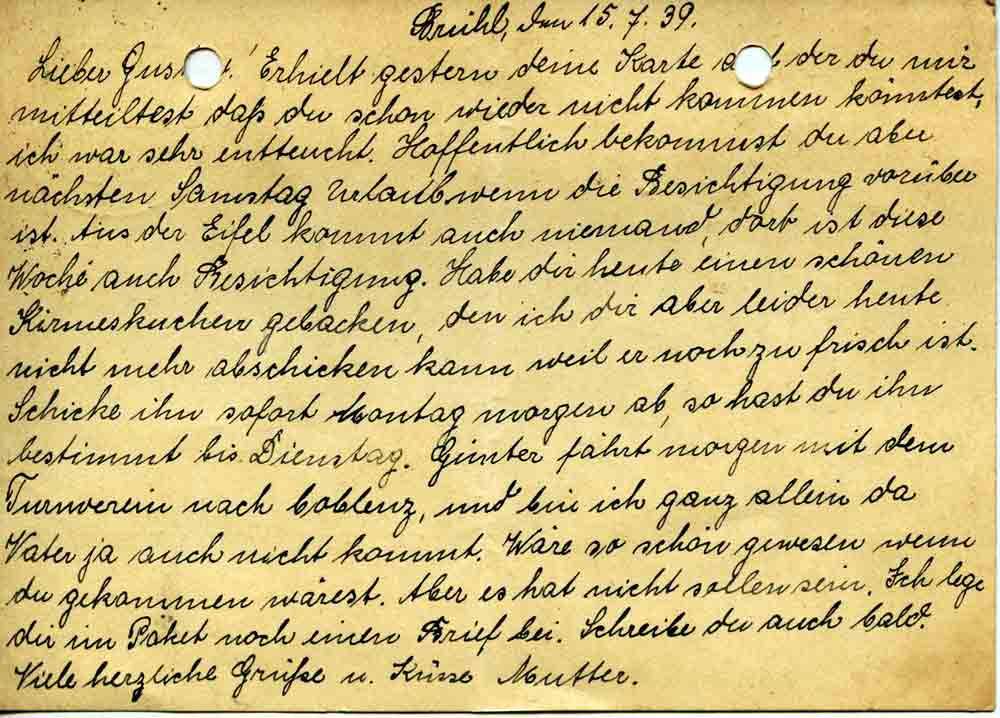 Lieber Gustav! Erhielt gestern deine Karte auf der du mir mitteiltest, daß du schon wieder nicht kommen könntest, ich war sehr entteucht. Hoffentlich bekommst du aber nächsten Samstag Urlaub wenn die Besichtigung vorüber ist. Aus der Eifel kommt auch niemand, dort ist diese Woche auch Besichtigung. Habe dir heute einen schönen Kirmeskuchen gebacken, den ich dir aber leider heute nicht mehr abschicken kann weil er noch zu frisch isst. Schicke ihn sofort Montag morgen ab, so hast du ihn bestimmt bis Dienstag. Günter fährt morgen mit dem Turnverein nach Coblenz, und bin ich ganz allein da Vater ja auch nicht kommt. Wäre so schön gewesen wenn du gekommen wärest. Aber es hat nicht sollen sein. Ich lege dir im Paket noch einen Brief bei. Schreibe du auch bald.