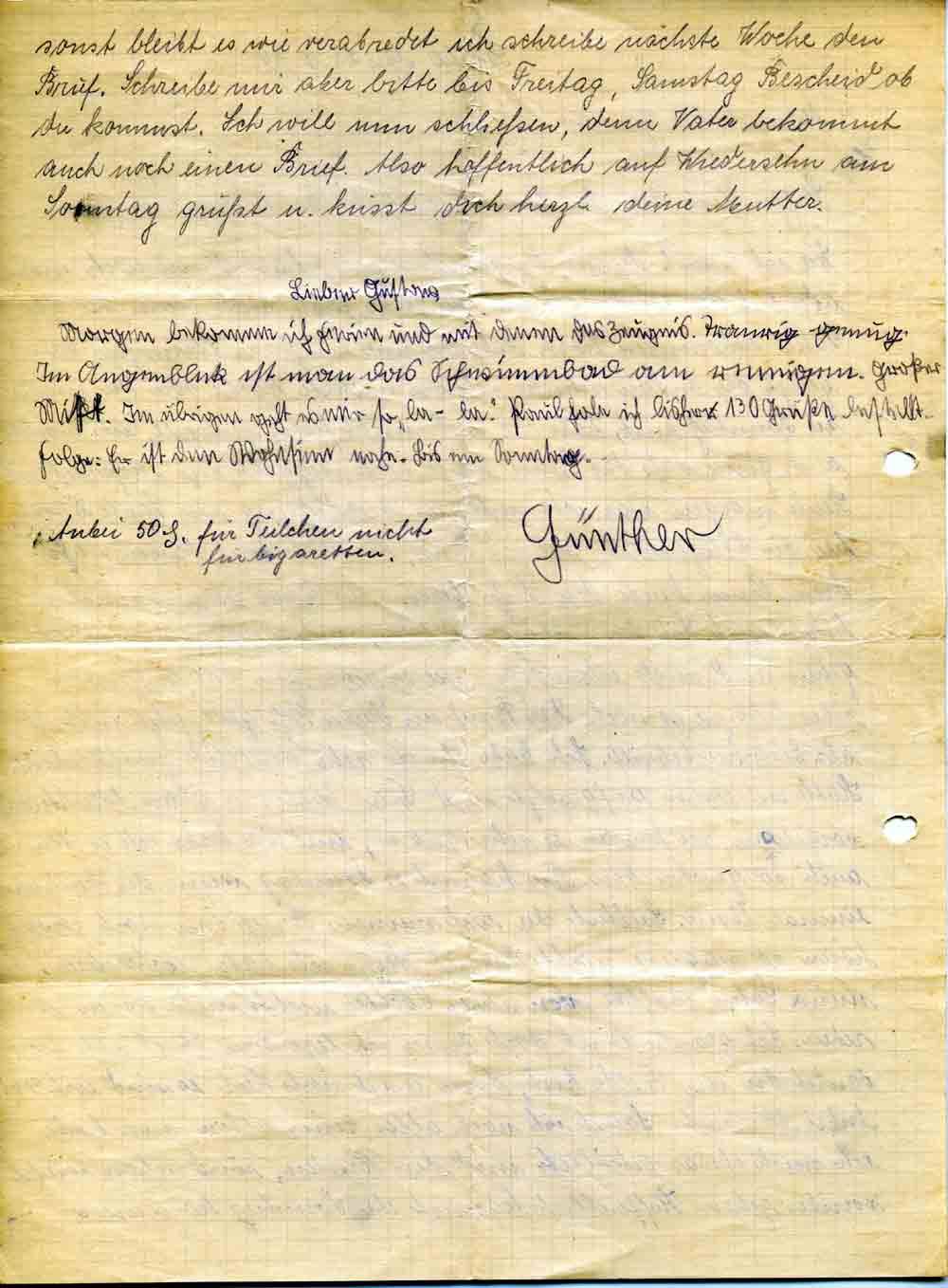 sonst bleibt es wie verabredet ich schreibe nächste Woche den Brief. Schreibe mir aber bitte bis Freitag, Samstag Bescheid ob du kommst. Ich will nun schließen, denn Vater bekommt auch noch einen Brief. Also hoffentlich auf Wiedersehn am Sonntag grüßt u. küsst dich herzl. deine Mutter.