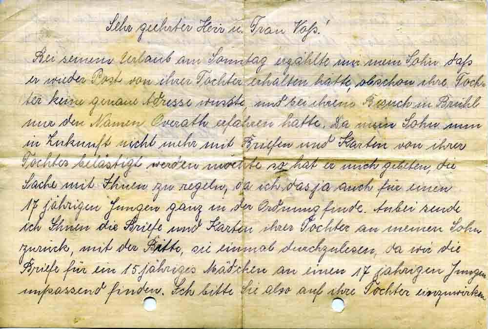 Bei seinem Urlaub am Sonntag erzählte mir mein Sohn daß er wieder Post von ihrer Tochter erhalten hätte, obschon ihre Tochter keine genaue Adresse wusste, und bei ihrem Besuch in Brühl nur den Namen Overath erfahren hatte. Da mein Sohn nun in Zukunft nicht mehr mit Briefen und Karten von ihrer Tochter belästigt werden möchte so hat er mich gebeten, die Sache mit Ihnen zu regeln, da ich das ja auch für einen 17 jährigen Jungen ganz in der Ordnung finde. Anbei sende ich Ihnen die Briefe und Karten ihrer Tochter an meinen Sohn zurück, mit der Bitte, sie einmal durchzulesen, da wir die Briefe für ein 15 jähriges Mädchen an einen 17 jährigen Jungen unpassend finden. Ich bitte Sie also auf ihre Tochter einzuwirken