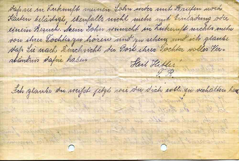 daß sie in Zukunft meinen Sohn weder mit Briefen noch Karten belästigt, ebenfalls nicht mehr mit Einladung oder einem Besuch. Mein Sohn wünscht in Zukunft nichts mehr von ihrer Tochter zu hören und zu sehen, und ich glaube daß Sie nach Durchsicht der Post ihrer Tochter volles Verständnis dafür haben