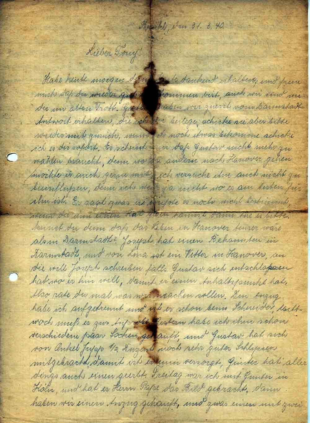 Habe heute morgen deine Karte dankend erhalten, und freue mich daß du wieder gut angekommen bist, auch wir sind wieder im alten Trott. Gestern haben wir zuerst vom Darmstadt Antwort erhalten, die ich dir beilege, schicke sie aber bitte wieder mit zurück, wenn ich noch etwas bekomme schicke ich es dir sofort. Es scheint nun, daß Gustav nicht mehr zu wählen braucht, denn wo die andern nach Hanover gehen möchte er auch gerne mit, ich versuche ihn auch nicht zu beeinflußen, denn ich weiß ja nicht wo es am besten für ihn ist. Er sagt zwar er wüßte es noch nicht bestimmt, wenn du ihm einen Rat geben kannst dann tue es bitte. Meinst du denn daß das Leben in Hanover teurer wäre als in Darmstadt? Joseph hat einen Bekannten in Darmstadt, und von Lina ist ein Vetter in Hanover, an die will Joseph schreiben falls Gustav sich entschlossen hat wo er hin will, damit er einen Anhaltspunkt hat. Also rate du mal was wir machen sollen. Den Anzug habe ich aufgetrennt und ist er schon beim Schneider, Mittwoch muß er zur Anprobe. Gestern habe ich ihm schon verschiedene paar Socken gekauft, und Gustav hat sich von Onkel Jupp ½ Duzent noch sehr guter Schlipsen mitgebracht, damit ist er nun versorgt, Günter hat allerdings auch einen geerbt. Freitag war ich mit Günter in Köln, und hat er Herrn Pape das Bild gebracht, dann haben wir einen Anzug gekauft, und zwar einen mit zwei