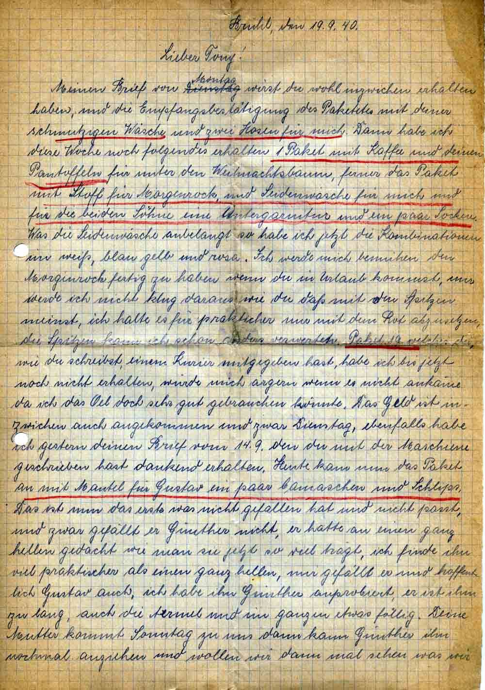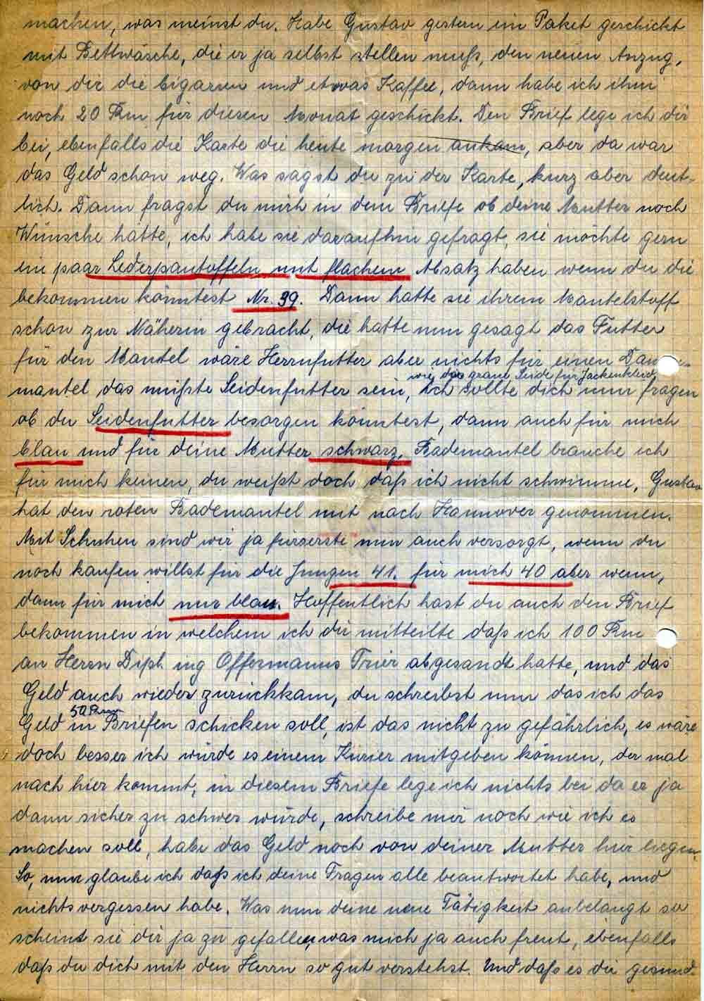 machen, was meinst du. Habe Gustav gestern ein Paket geschickt mit Bettwäsche, die er ja selbst stellen muß, den neuen Anzug, von dir die Cigarren und etwas Kaffee, dann habe ich ihm noch 20 Rm für diesen Monat geschickt. Den Brief lege ich dir bei, ebenfalls die Karte die heute morgen ankam, aber da war das Geld schon weg. Was sagst du zu der Karte, kurz aber deutlich. Dann fragst du mich in dem Briefe ob deine Mutter noch Wünsche hätte, ich habe sie daraufhin gefragt, sie möchte gern ein paar Lederpantoffel mit flachem Absatz haben wenn du die bekommen könntest Nr. 39. Dann hatte sie ihren Mantelstoff schon zur Näherin gebracht, die hatte nun gesagt das Futter für den Mantel wäre Herrnfutter aber nichts für einen Damenmantel das müßte Seidenfutter sein, wie die graue Seide für Jackenkleid, ich sollte dich nun fragen ob du Seidenfutter besorgen könntest, dann auch für mich blau und für deine Mutter schwarz. Bademantel brauche ich für mich keinen, du weißt doch daß ich nicht schwimme. Gustav hat den roten Bademantel mit nach Hannover genommen. Mit Schuhen sind wir ja fürserste nun auch versorgt, wenn du noch kaufen willst für die Jungen, 41, für mich 40 aber wenn, dann für mich nur blau. Hoffentlich hast du auch den Brief bekommen in welchem ich dir mitteilte daß ich 100 Rm an Herrn Dipl.ing. Offermann Trier abgesandt hatte, und das Geld auch wieder zurückkam, du schreibst nun das ich das Geld 50 Rm in Briefen schicken soll, ist das nicht zu gefährlich, es wäre doch besser ich würde es einem Kurier mitgeben können, der mal nach hier kommt, in diesem Briefe lege ich nichts bei da er ja dann sicher zu schwer würde, schreibe mir noch wie ich es machen soll, habe das Geld noch von deiner Mutter hier liegen. So, nun glaube ich daß ich deine Fragen alle beantwortet habe, und nichts vergessen habe. Was nun deine neue Tätigkeit anbelangt so scheint sie dir ja zu gefallen, was mich ja auch freut, ebenfalls daß du dich mit den Herrn so gut verstehst. Und daß es dir gesund