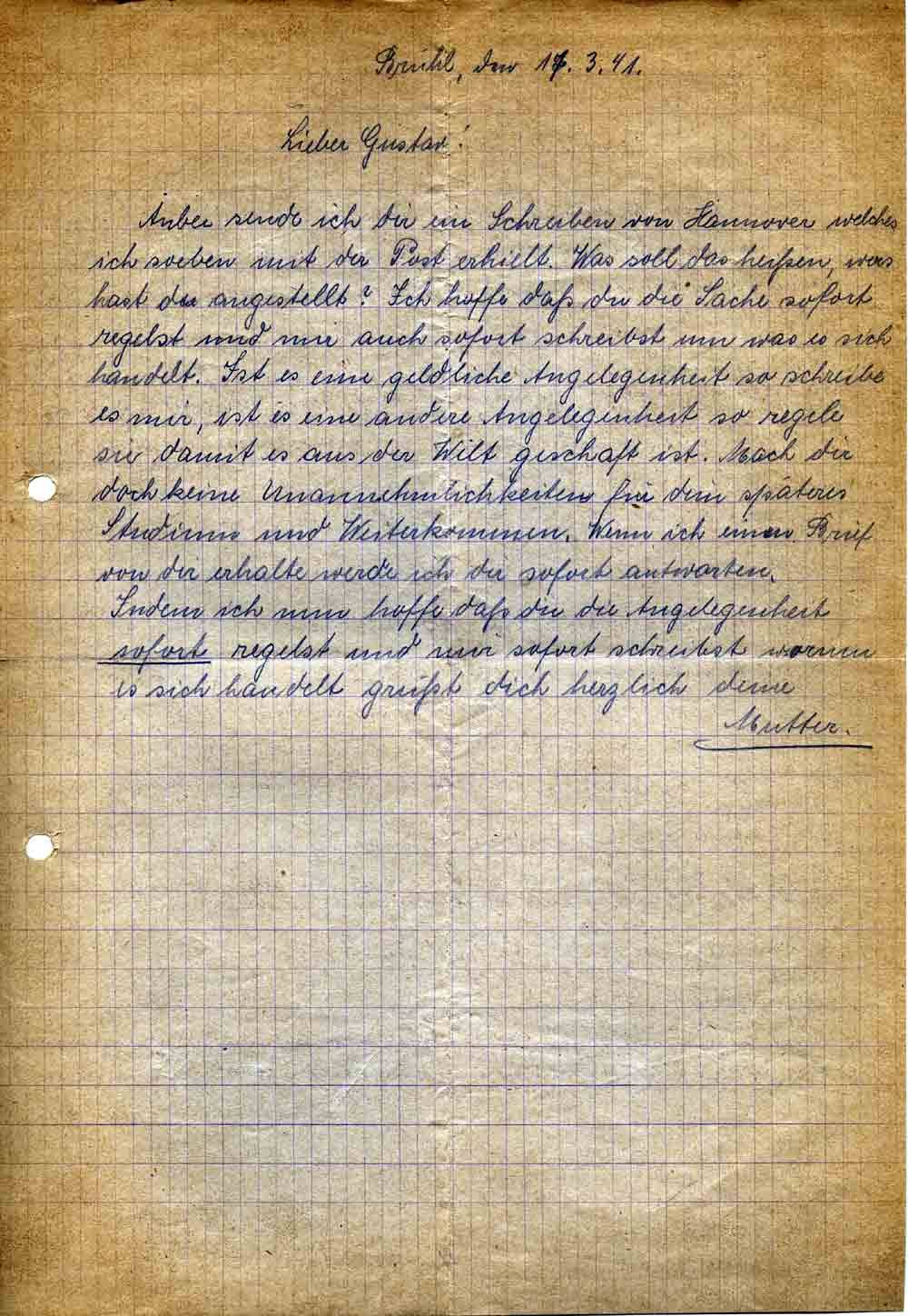 Elisabeth Roos an Sohn Gustav, 17. März 1941