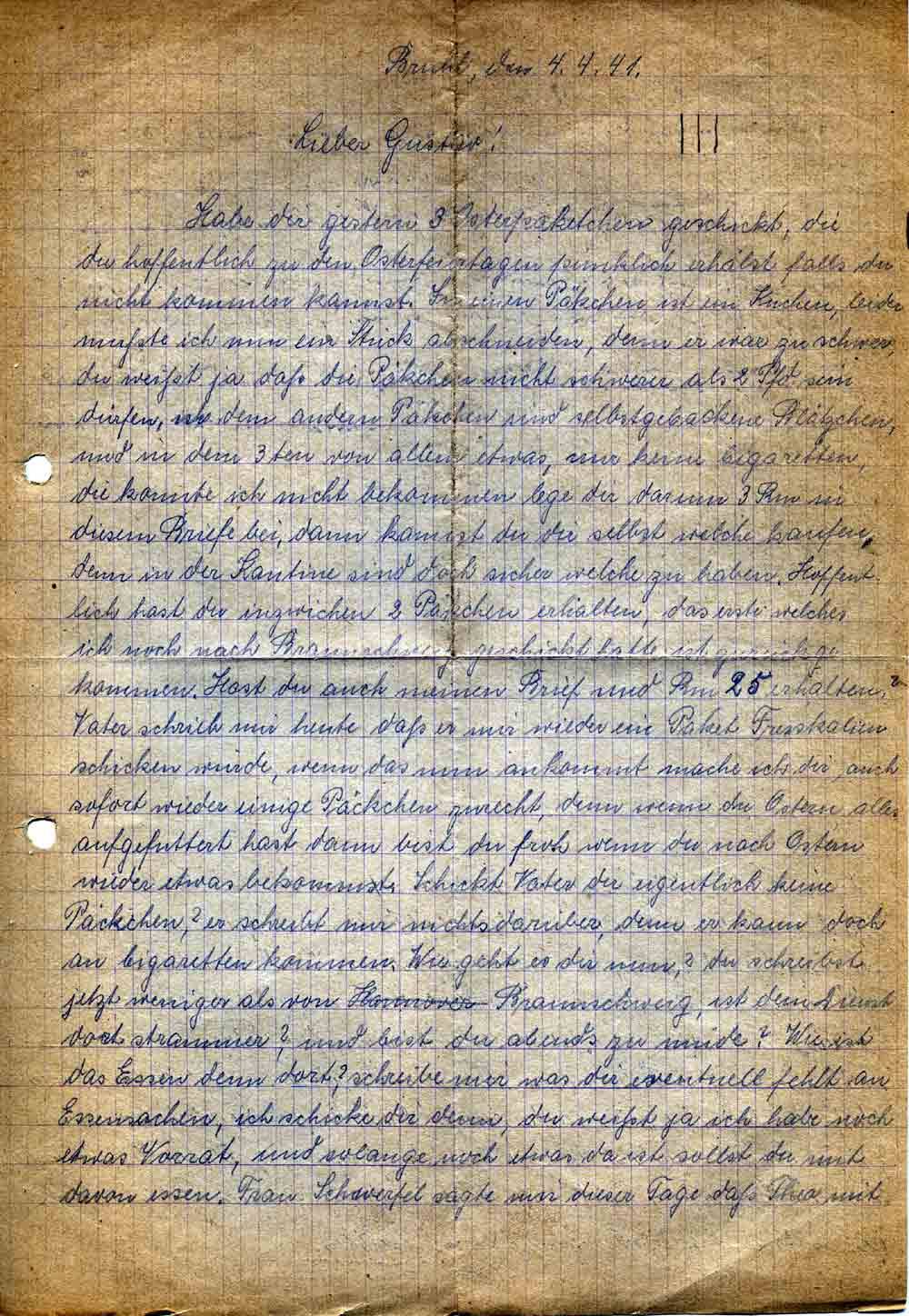 Habe dir gestern 3 Osterpaketchen geschickt, die du hoffentlich zu den Osterfeiertagen pünktlich erhälst falls du nicht kommen kannst. In einem Päkchen ist ein Kuchen, leider mußte ich nun ein Stück abschneiden, denn er war zu schwer, du weißt ja daß die Päkchen nicht schwerer als 2 Pfd sein dürfen, in dem andern Päkchen sind selbstgebackene Plätzchen, und in dem 3ten von allem etwas, nur keine Cigaretten, die konnte ich nicht bekommen lege dir darum 3 Rm in diesem Briefe bei, dann kannst du dir selbst welche kaufen, denn in der Kantine sind doch sicher welche zu haben. Hoffentlich hast du inzwischen 2 Päkchen erhalten, das erste welches ich noch nach Braunschweig geschickt hatte ist zurück gekommen. Hast du auch meinen Brief und Rm 25 erhalten? Vater schrieb mir heute daß er mir wieder ein Paket Fresskalien schicken würde, wenn das nun ankommt mache ich dir auch sofort wieder einige Päckchen zurecht, denn wenn du Ostern alles aufgefuttert hast dann bist du froh wenn du nach Ostern wieder etwas bekommst. Schickt Vater dir eigentlich keine Päckchen? er schreibt mir nichts darüber, denn er kann doch an Cigaretten kommen. Wie geht es dir nun? du schreibst jetzt weniger als von Braunschweig, ist dein Dienst dort stramm? und bist du abends zu müde? Wie ist das Essen denn dort? schreibe mir was dir eventuell fehlt an Essensachen, ich schicke dir denn, du weißt ja ich habe noch etwas Vorrat, und solange noch etwas da ist sollst du mit davon essen. Frau Schwerfel sagte mir dieser Tage daß Theo mit