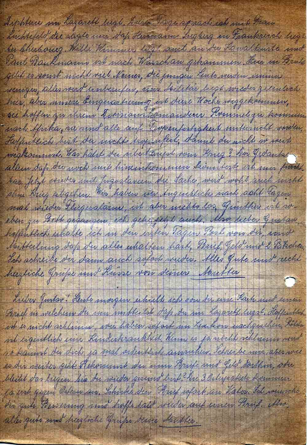 Diphterie im Lazarett liegt. Dieser Tage sprach ich mit Frau Lüchtefeld, die sagte mir daß Hermann Siegberg in Frankreich liegt bei Cherbourg. Willi Wimmer liegt auch an der Kanalküste und Paul Bankmann ist nach Warschau gekommen. Hier in Brühl gibt es sonst nicht viel Neues, die jungen Leute werden immer weniger, alles wird einberufen, nur Militär liegt wieder ziemlich hier, aber unsere Einquartierung ist diese Woche weggekommen, sie hoffen zu ihrem Divisionskomandeur Rommel zu kommen nach Afrika, sie sind alle auf Tropenfestigkeit untersucht worden. Hoffentlich bist du nicht tropenfest, damit du nicht so weit wegkommst. Was hälst du überhaupt vom Krieg? Der Gedanke allein daß du noch mit hineinkommen könntest ist mir furchtbar. Jetzt wieder mit Jugoslawien die Sache, wird wohl auch nicht ohne Krieg abgehen. Wir haben im Augenblick nach acht Tagen mal wieder Fliegeralarm, ist aber nichts los. Günther ist soeben zu Bett gegangen, ich gehe jetzt auch. Also, lieber Gustav, hoffentlich erhalte ich in den ersten Tagen Post von dir, und Mitteilung, daß du alles erhalten hast, Brief, Geld und 2 Päckchen. Ich schreibe dir dann auch sofort wieder. Alles Gute und recht herzliche Grüße und Küsse von deiner Mutter.