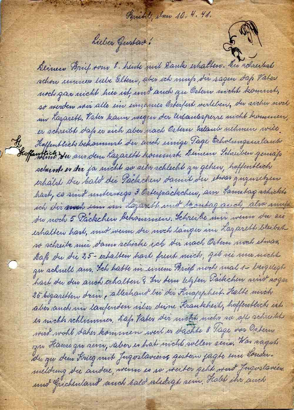 Deinen Brief vom 8. heute mit Dank erhalten. Du schreibst schon immer liebe Eltern, aber ich muß dir sagen daß Vater noch gar nicht hier ist, und auch zu Ostern nicht kommt, so werden wir alle ein einsames Osterfest verleben, du sicher noch im Lazarett. Vater kann wegen der Urlaubssperre nicht kommen, er schreibt daß er sich aber nach Ostern Urlaub nehmen will. Hoffentlich bekommst du auch einige Tage Erholungsurlaub wenn du aus dem Lazarett kommst. Deinem Schreiben gemäß scheint es dir ja nicht so sehr schlecht zu gehen, hoffentlich erhälst du bald die Päckchen damit du etwas zuzusetzen hast, es sind unterwegs 3 Osterpäckchen, am Samstag schickte ich dir noch eins ins Lazarett und Montag auch, also mußt du noch 5 Päckchen bekommen. Schreibe mir wenn du sie erhalten hast, und wenn du noch länger im Lazarett bleibst so schreibe mir dann schicke ich dir nach Ostern noch etwas. Daß du die 25- erhalten hast freut mich, gib sie nur nicht zu schnell aus. Ich hatte in einem Brief noch mal 1- beigelegt hast du den auch erhalten? In dem letzten Päckchen sind sogar 25 Cigaretten drin, allerhand bei der Knappheit. Halte mich aber auch im laufenden über deine Krankheit, hoffentlich ist es nichts schlimmes. Daß Vater dir nicht mehr so oft schreibt wird wohl daher kommen weil er dachte 8 Tage vor Ostern zu Hause zu sein, aber es hat nicht sollen sein. Was sagst du zu dem Krieg mit Jugoslawien, gestern jagte eine Sondermeldung die andere, wenn es so weiter geht wird Jugoslawien und Griechenland auch bald erledigt sein. Habt ihr auch