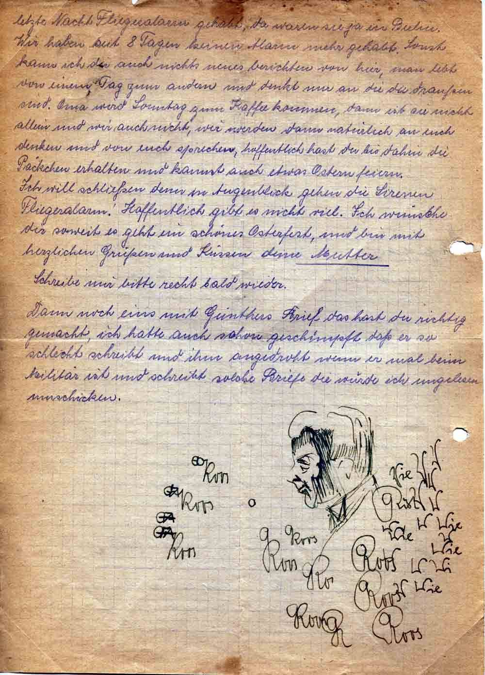 Ich will schließen denn im Augenblick gehen die Sirenen Fliegeralarm! Hoffentlich gibt es nicht viel. Ich wünsche dir soweit es geht ein schönes Osterfest, und bin mit herzlichen Grüßen und Küssen deine Mutter