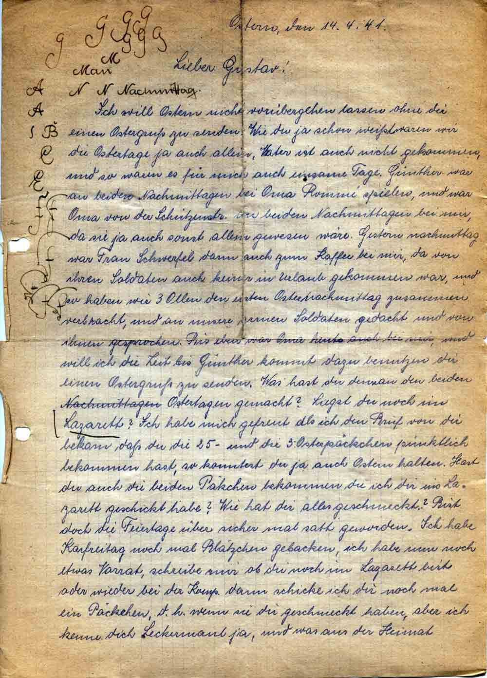 Ich will Ostern nicht vorübergehen lassen ohne dir einen Ostergruß zu senden. Wie du ja schon weißt waren wir die Ostertage ja auch allein, Vater isst auch nicht gekommen, und so waren es für mich auch einsame Tage. Günther war an beiden Nachmittagen bei Oma Rommé spielen, und war Oma von der Schützenstr. an beiden Nachmittagen bei mir, da sie ja auch sonst allein gewesen wäre. Gestern nachmittag war Frau Schwerfel dann auch zum Kaffee bei mir, da von ihren Soldaten auch keiner in Urlaub gekommen war, und so haben wir 3 Ollen den ersten Osternachmittag zusammen verbracht, und an unsere armen Soldaten gedacht und von ihnen gesprochen. Bis eben war Oma heute auch bei mir, und will ich die Zeit bis Günther kommt dazu benutzen dir einen Ostergruß zu senden. Was hast du denn an den beiden Ostertagen gemacht? Liegst du noch im Lazarett? Ich habe mich gefreut als ich den Brief von dir bekam, daß du die 25- und die 3 Osterpäckchen pünktlich bekommen hast, so konntest du ja auch Ostern halten. Hast du auch die beiden Päkchen bekommen die ich dir ins Lazarett geschickt hab e? Wie hat dir alles geschmeckt? Bist doch die Feiertage über sicher mal satt geworden. Ich habe Karfreitag noch mal Plätzchen gebacken, ich habe nun noch etwas Vorrat, schreibe mir ob du noch im Lazarett bist oder wieder bei der Komp. dann schicke ich dir noch mal ein Päckchen, d. h. wenn sie dir geschmeckt haben, aber ich kenne dich Leckermaul ja, und was aus der Heimat