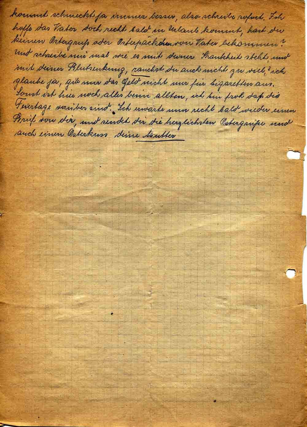 kommt schmeckt ja immer besser, also schreibe sofort. Ich hoffe das Vater doch recht bald in Urlaub kommt, hast du keinen Ostergruß oder Osterpäckchen von Vater bekommen? Und schreibe mir mal wie es mit deiner Krankheit steht, und mit deiner Blutsenkung, rauchst du auch nicht zu viel? ich glaube ja, gib nur das Geld nicht nur für Cigaretten aus. Sonst ist hier noch alles beim alten, ich bin froh daß die Feiertage vorüber sind. Ich erwarte nun recht bald wieder einen Brief von dir, und sendet dir die herzlichsten Ostergrüße und auch einen Osterkuss deine Mutter.