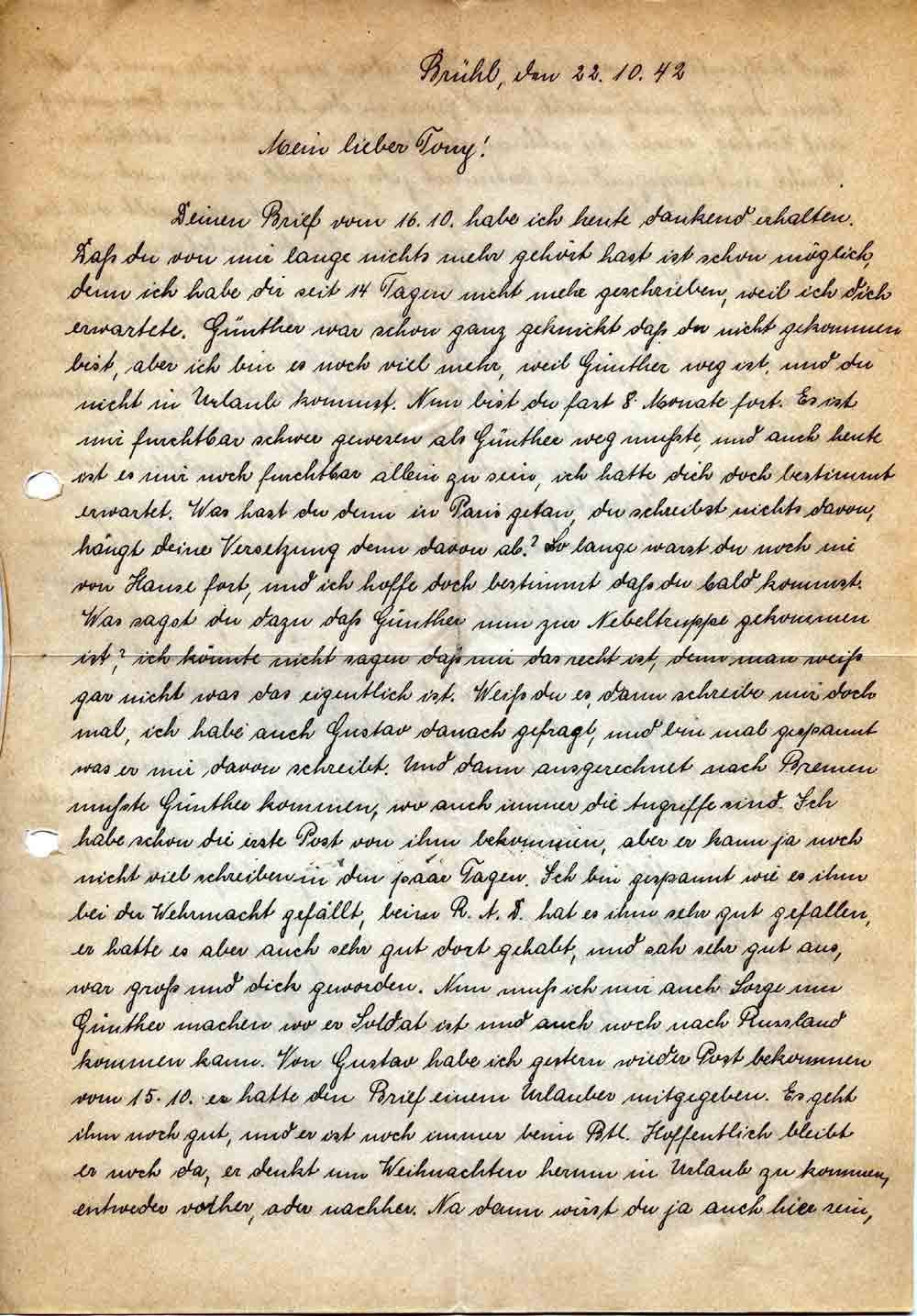 Deinen Brief vom 16.10. habe ich heute dankend erhalten. Daß du von mir lange nichts mehr gehört hast ist schon möglich, denn ich habe dir seit 14 Tagen nicht mehr geschrieben, weil ich dich erwartete. Günther war schon ganz geknickt daß du nicht gekommen bist, aber ich bin es noch viel mehr, weil Günther weg ist, und du nicht in Urlaub kommst. Nun bist du fast 8 Monate fort. Es ist mir furchtbar schwer gewesen als Günther weg mußte, und auch heute ist es mir noch furchtbar allein zu sein, ich hatte dich doch bestimmt erwartet. Was hast du denn in Paris getan, du schreibst nichts davon, hängt deine Versetzung denn davon ab? So lange warst du noch nie von Hause fort, und ich hoffe doch bestimmt daß du bald kommst. Was sagst du dazu daß Günther nun zur Nebeltruppe gekommen ist? ich könnte nicht sagen daß mir das recht ist, denn man weiß gar nicht was das eigentlich ist. Weiß du es, dann schreibe mir doch mal, ich habe auch Gustav danach gefragt, und bin mal gespannt was er mir davon schreibt. Und dann ausgerechnet nach Bremen mußte Günther kommen, wo auch immer die Angriffe sind. Ich habe schon die erste Post von ihm bekommen, aber er kann ja noch nicht viel schreiben in den paar Tagen. Ich bin gespannt wie es ihm bei der Wehrmacht gefällt, beim R.A.D. hat es ihm sehr gut gefallen, er hatte es aber auch sehr gut dort gehabt, und sah sehr gut aus, war groß und dick geworden. Nun muß ich mir auch Sorge um Günther machen wo er Soldat ist und auch noch nach Russland kommen kann. Von Gustav habe ich gestern wieder Post bekommen vom 15.10. er hatte den Brief einem Urlauber mitgegeben. Es geht ihm noch gut, und er ist noch immer beim Btl. Hoffentlich bleibt er noch da, er denkt um Weihnachten herum in Urlaub zu kommen, entweder vorher, oder nachher. Na dann wirst du ja auch hier sein,